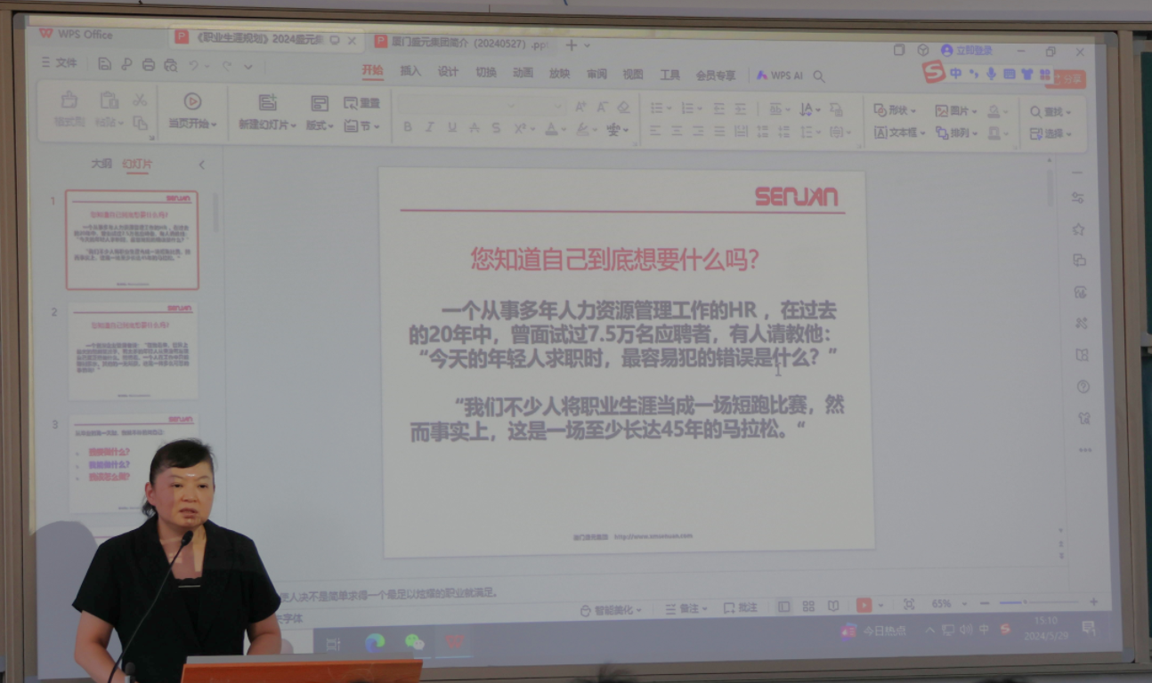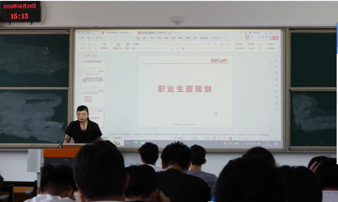 為了讓學生提前了解企業(yè)需求和行業(yè)動態(tài),有針對性地提升自己的技能和素質(zhì),提高就業(yè)的適配性和成功率,同時也為企業(yè)儲備人才,加強校企合作,給即將走出校園的學子提供更多了解職場、做好職業(yè)生涯規(guī)劃。2024529日下午,汽車學院邀請廈門盛元集團資深人事總監(jiān)黃蓉女士為2022級部分學生做了一場精彩的職業(yè)生涯規(guī)劃講座。
