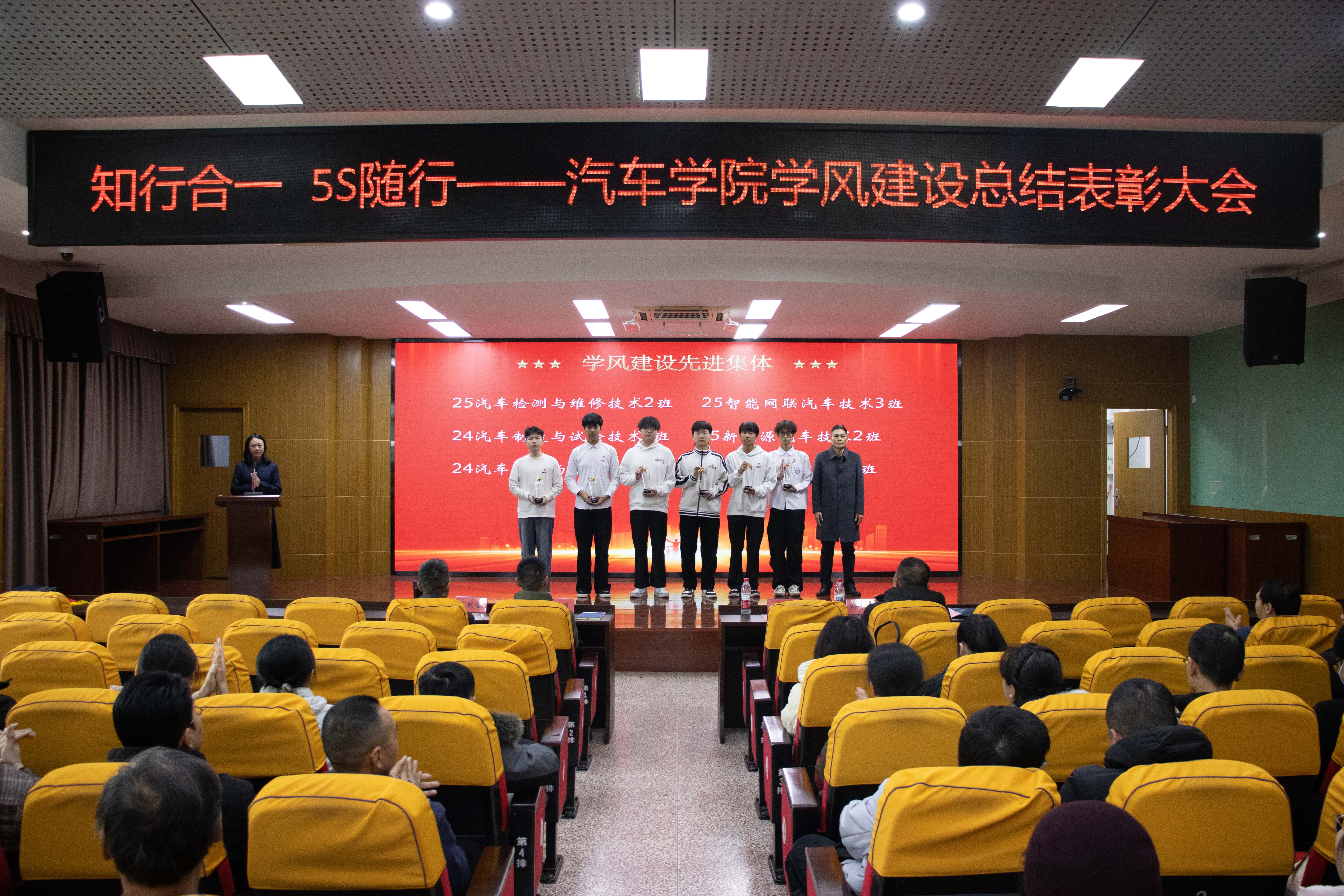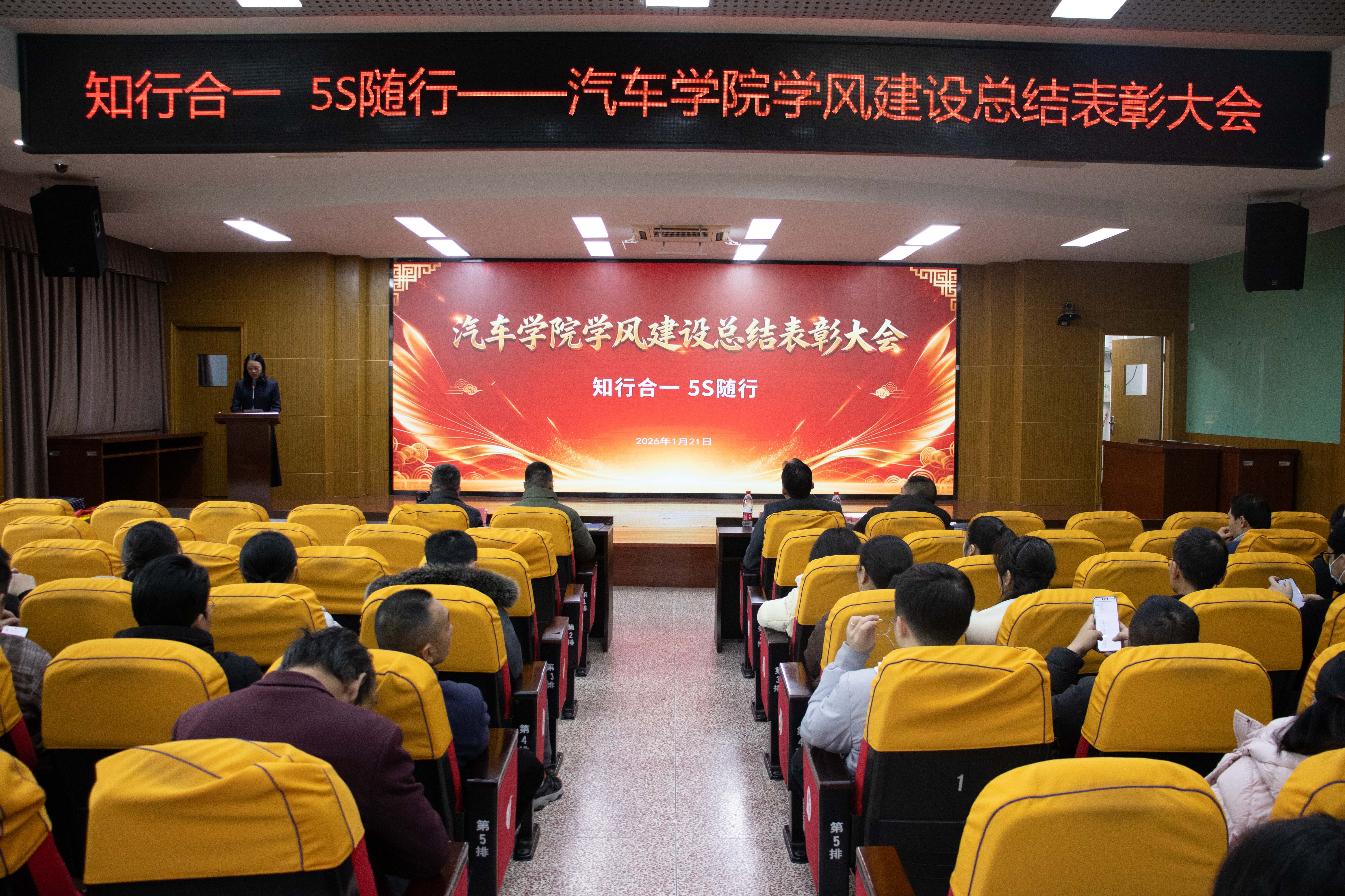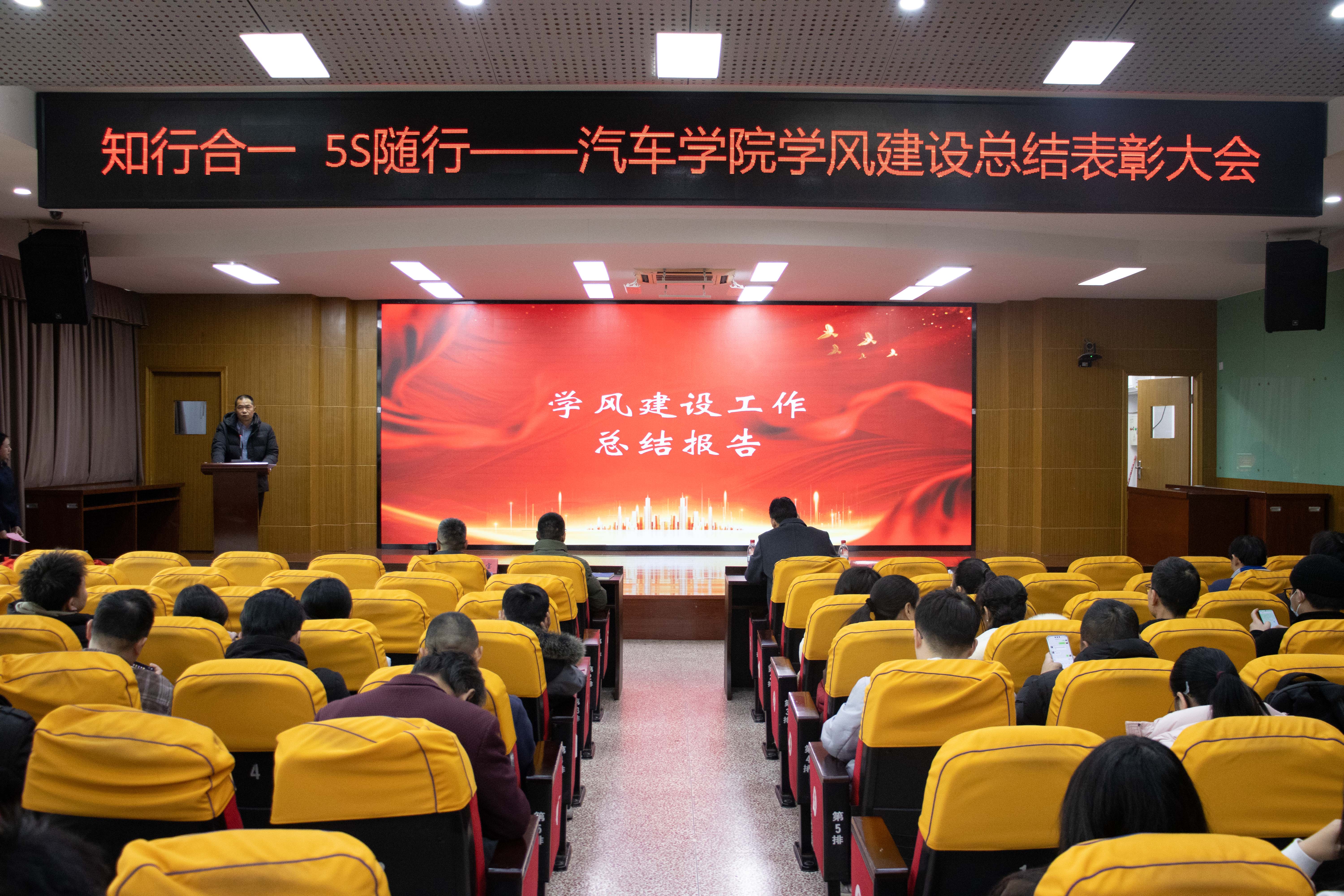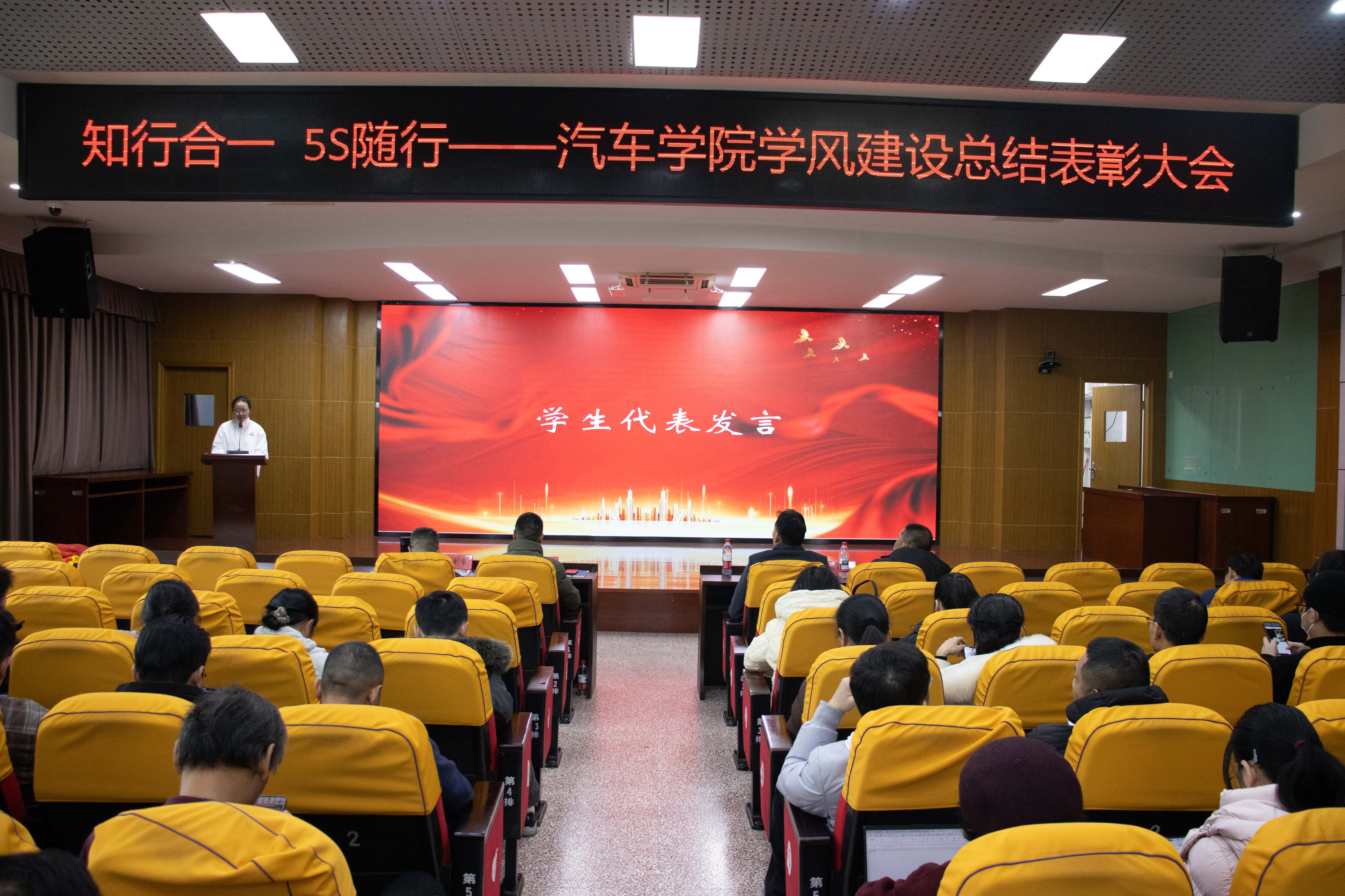 為進一步加強學風建設(shè),表彰先進、樹立典型,汽車學院于1月21日在北區(qū)一號行政樓6樓學術(shù)報告廳開展“知行合一、5S隨行”——汽車學院學風建設(shè)總結(jié)表彰大會。學院領(lǐng)導班子、全體教師、輔導員及各班級學生代表參加此次大會。大會由分團委書記余晨煒主持。