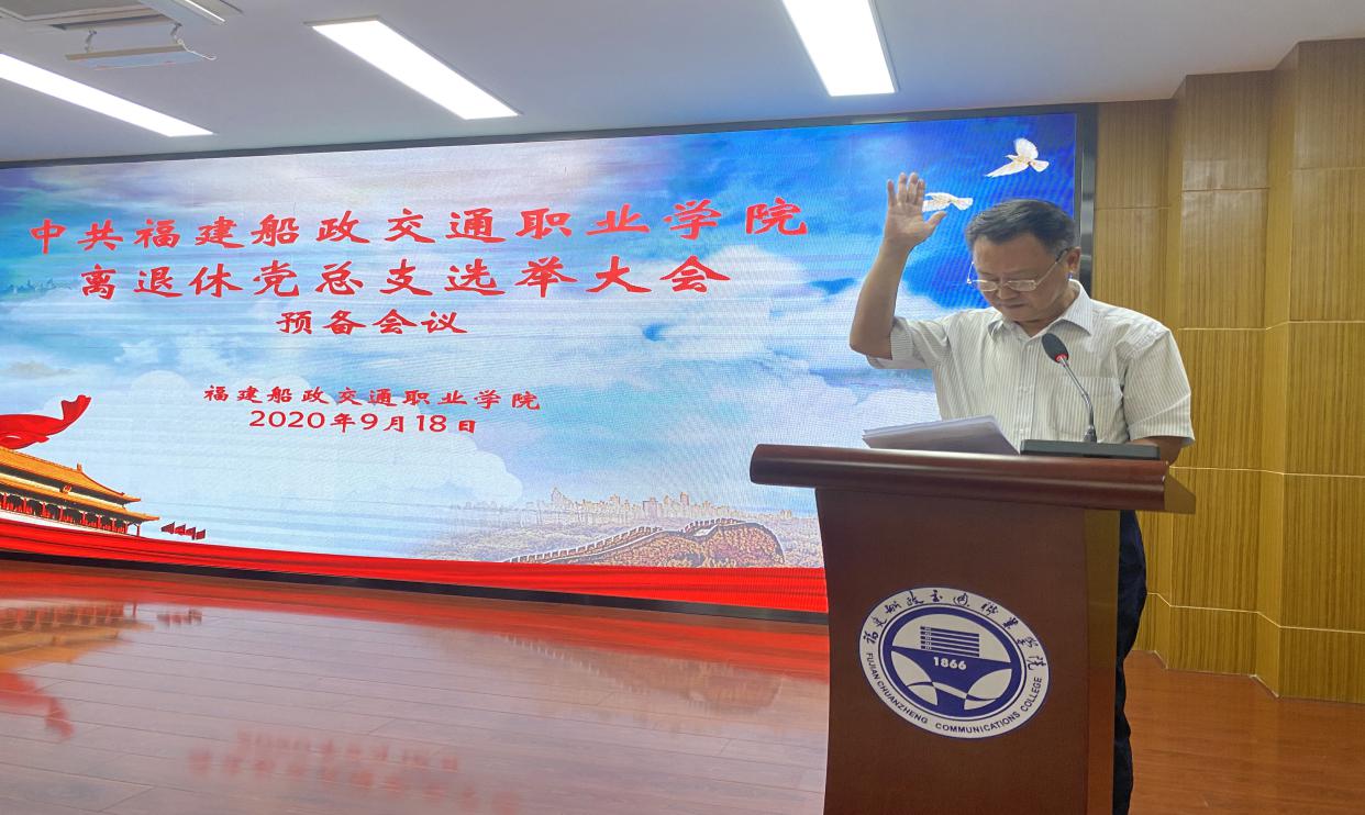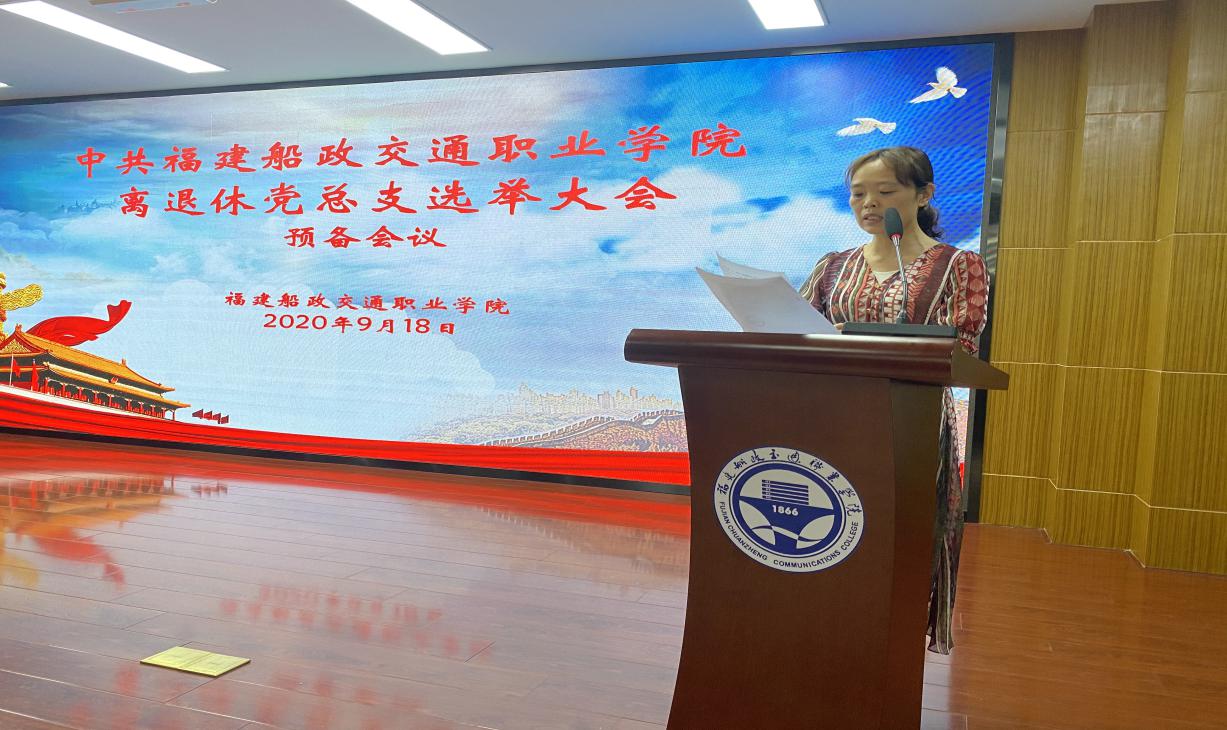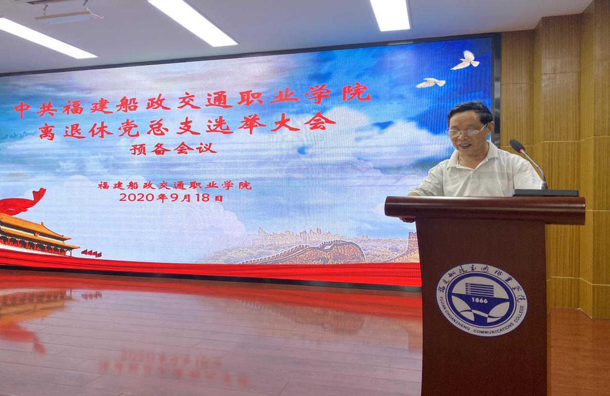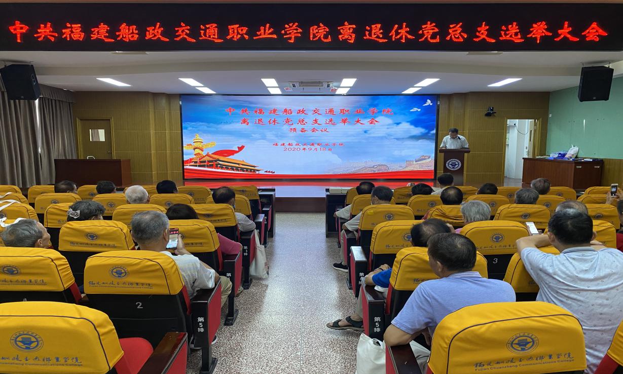 2020918日上午,福建船政交通職業(yè)學(xué)院離退休黨總支成立大會(huì)在一號(hào)樓六樓學(xué)術(shù)報(bào)告廳舉行。大會(huì)由退休黨員王向民同志主持,50余名離退休黨員參加成立大會(huì)。