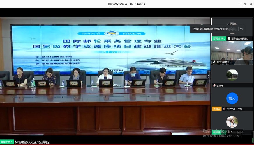 2020年7月10日,學院聯(lián)合武漢交通職業(yè)學院和浙江交通職業(yè)技術學院共同主持召開職業(yè)教育國際郵輪乘務管理專業(yè)國家級教學資源庫項目建設工作推進大會。由于新冠肺炎疫情防控常態(tài)化的需要,本次會議在騰訊會議網(wǎng)絡平臺上召開,學院陳艷紅副院長、航海技術系江明光主任協(xié)同資源庫各課程負責人共同參會。來自行業(yè)企業(yè)的專家和各參建單位代表共計一百三十多人,以個人連線的方式加入線上會議。