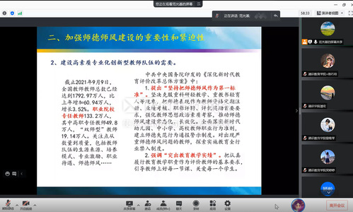 為進(jìn)一步加強(qiáng)學(xué)院師德師風(fēng)建設(shè),實(shí)施“五個(gè)一”師德師風(fēng)建設(shè)機(jī)制,通識(shí)教育學(xué)院分別于9月22日、26日下午邀請(qǐng)校外專家在線開(kāi)展師德師風(fēng)專題培訓(xùn),通識(shí)教育學(xué)院全體教師和各二級(jí)學(xué)院部分教師參加培訓(xùn),兩場(chǎng)培訓(xùn)由通識(shí)教育學(xué)院副院長(zhǎng)金晶晶主持。