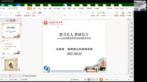 9月22日下午,福建師范大學(xué)外國(guó)語(yǔ)學(xué)院王保昌老師以“教書(shū)育人教研結(jié)合——高校教師的職業(yè)道德和職業(yè)發(fā)展”為題開(kāi)展師德師風(fēng)專題培訓(xùn),分享對(duì)教師職業(yè)的理解,闡明高校教師師德師風(fēng)建設(shè)的重要性,從時(shí)代變化分析高校教師職業(yè)發(fā)展中的機(jī)遇與挑戰(zhàn),提出發(fā)展方向、道路等工作建議,既要做到“學(xué)高為師,身正為范”,具備有高超的教育教學(xué)能力,更要有高尚的人格品質(zhì),爭(zhēng)做“四有”好老師、當(dāng)好“四個(gè)引路人”、實(shí)現(xiàn)“四個(gè)相統(tǒng)一”。最后,王老師建議,高校教師要結(jié)合教學(xué)工作開(kāi)展教學(xué)研究,以教學(xué)研究帶動(dòng)教學(xué)工作,實(shí)現(xiàn)二者融合發(fā)展。