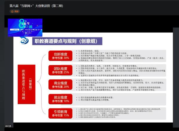 為確保培訓(xùn)的正常進(jìn)行,創(chuàng)新創(chuàng)業(yè)學(xué)院主動(dòng)聯(lián)系各職業(yè)院校了解需求,尋找合適的線上培訓(xùn)平臺(tái),組織報(bào)名,對(duì)接專家,安排課程,盡心盡力做好集訓(xùn)準(zhǔn)備工作。在大家共同努力下,三天四場(chǎng)的線上培訓(xùn)順利完成。每場(chǎng)講座全省職業(yè)院校和應(yīng)用型本科院校師生踴躍參加,培訓(xùn)組織有序,線上授課順暢,討論互動(dòng)環(huán)節(jié)氣氛熱烈,參訓(xùn)的師生表示:本次集訓(xùn)營(yíng)讓大家對(duì)“互聯(lián)網(wǎng)+”大學(xué)生創(chuàng)新創(chuàng)業(yè)大賽的政策有了更加直觀體會(huì)和準(zhǔn)確認(rèn)知,明確了大賽項(xiàng)目培育的重點(diǎn)和核心邏輯,提升了項(xiàng)目團(tuán)隊(duì)的參賽信心,為下一階段校賽和省賽打下良好基礎(chǔ)。培訓(xùn)結(jié)束,我們還安排回放和授課的課件分享,為奮戰(zhàn)在抗疫一線的泉州和廈門職業(yè)院校師生提供再學(xué)習(xí)機(jī)會(huì)。