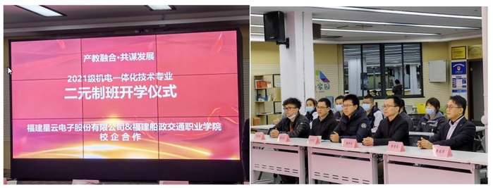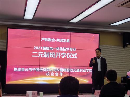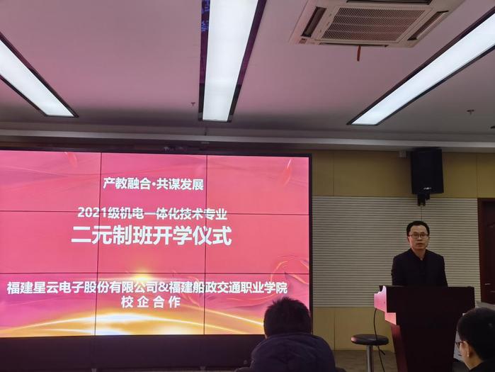 2022年1月13日,福建船政交通職業(yè)學院機械與智能制造學院2021級機電一體化技術(shù)專業(yè)“二元制”班級開學儀式在福建星云電子股份有限公司隆重舉行。福建星云電子股份有限公司首席運營官黃榮發(fā)先生,人力資源總監(jiān)魯亞男女士,機械與智能制造學院楊開懷院長,王水發(fā)副院長等校企工作人員以及“二元制”班級的所有同學共同出席典禮。