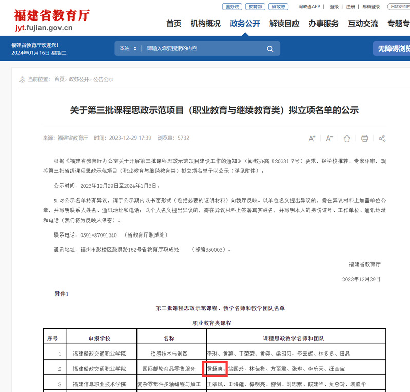 近日,福建省教育廳公布第三批課程思政示范項(xiàng)目(職業(yè)教育與繼續(xù)教育類)名單,由航海技術(shù)專業(yè)群骨干教師黃超夷主持的《國(guó)際游輪商品零售服務(wù)》課程獲批省級(jí)課程思政示范課程。
