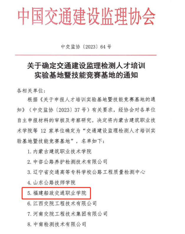 日前,在中國(guó)交通建設(shè)監(jiān)理協(xié)會(huì)組織的交通建設(shè)監(jiān)理檢測(cè)人才培訓(xùn)實(shí)驗(yàn)基地暨技能競(jìng)賽基地評(píng)審認(rèn)定工作中,專業(yè)群交通土建標(biāo)準(zhǔn)化施工產(chǎn)教融合實(shí)訓(xùn)基地成功入圍并獲批。