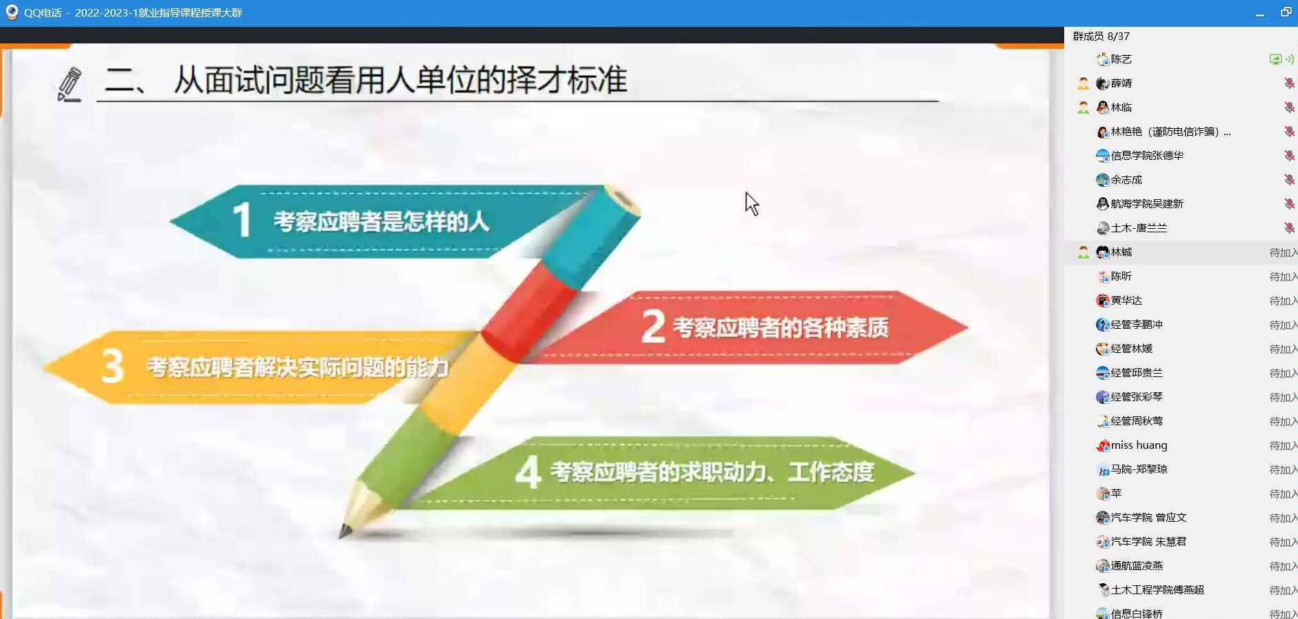 8月10日,馬克思主義學(xué)院就業(yè)與創(chuàng)業(yè)教研室按計(jì)劃舉辦了本學(xué)期第五次線上集體備課活動(dòng)。本次活動(dòng)由就業(yè)與創(chuàng)業(yè)教研室主任薛靖老師主持,由老師陳藝主講,其他講授本課的專兼職教師共同參與,本次備課主題為“第五講求職技巧”。