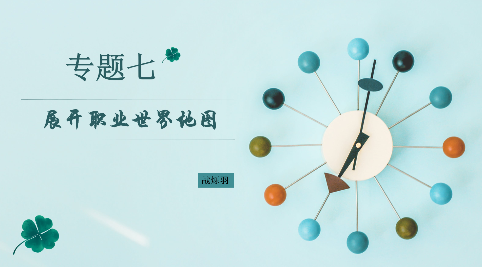 首先由戰(zhàn)偉老師詳細(xì)介紹“專題七 展開職業(yè)世界地圖”和“專題八 做好職業(yè)準(zhǔn)備”共4課時的整體教學(xué)設(shè)計。