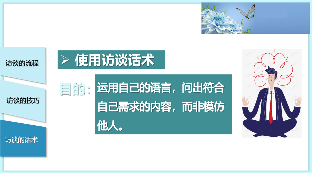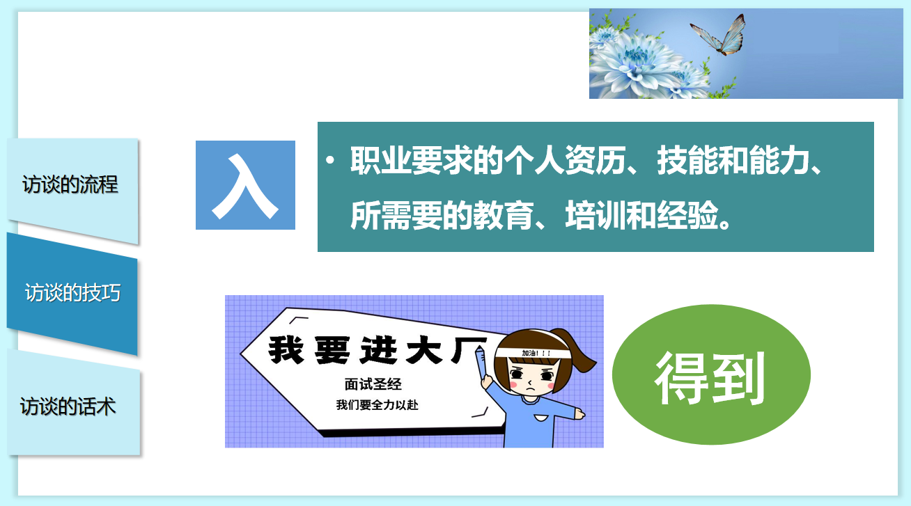 戰(zhàn)偉老師站在企業(yè)的角度,強調(diào)從“行業(yè)+組織+崗位”的角度理解職業(yè),從“入、做、得、拓”四個方面深入開展生涯人物訪談活動,同時結(jié)合實例建議了適合的教學(xué)方法和重難點的突破策略。