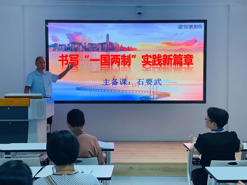 本次集體備課的專題是《書寫“一國兩制”實(shí)踐新篇章》,石要武老師進(jìn)行了教材分析和學(xué)情分析,強(qiáng)調(diào)了教學(xué)目標(biāo)和教學(xué)重難點(diǎn),還給出了教學(xué)建議,然后從舉世公認(rèn)的非凡成就、鑒往知來的深刻啟示以及由治及興的光明前景三部分進(jìn)行了詳細(xì)的教學(xué)講解,結(jié)合歷史以及現(xiàn)實(shí),從法理和現(xiàn)狀等多角度說明正是因?yàn)椴扇×恕耙粐鴥芍啤?,香港才迎來了輝煌的明天。