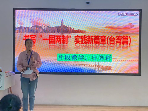 莊智群老師進(jìn)行了片段教學(xué),她講解的主題是《“一國兩制”臺灣篇》,從一國兩制的最早提出就是針對臺灣這一角度開始,分析了兩岸的政治關(guān)系,經(jīng)濟(jì)關(guān)系,還具體分析了當(dāng)下兩岸的民情民意,說明兩岸的統(tǒng)一是大勢所趨。