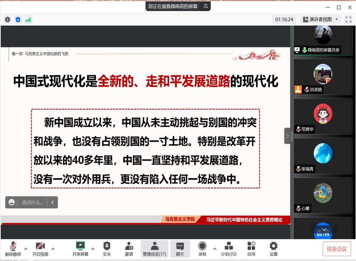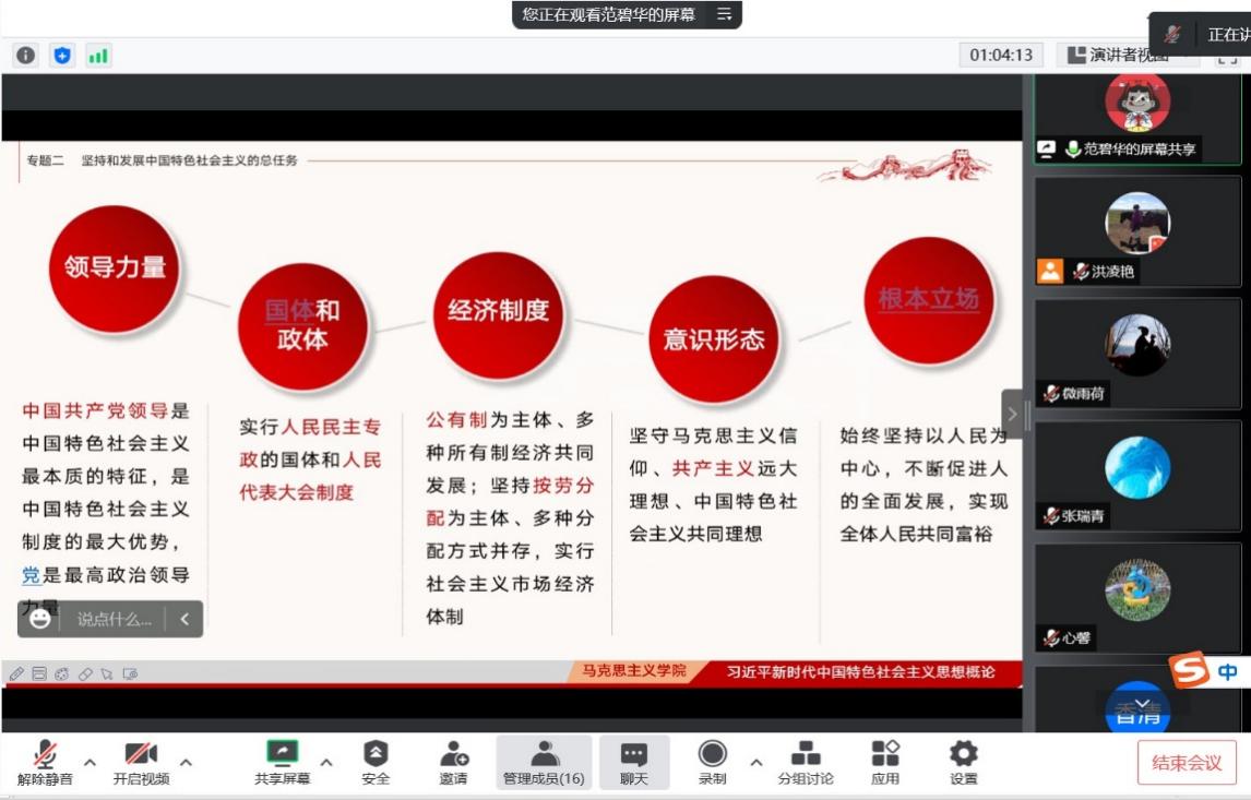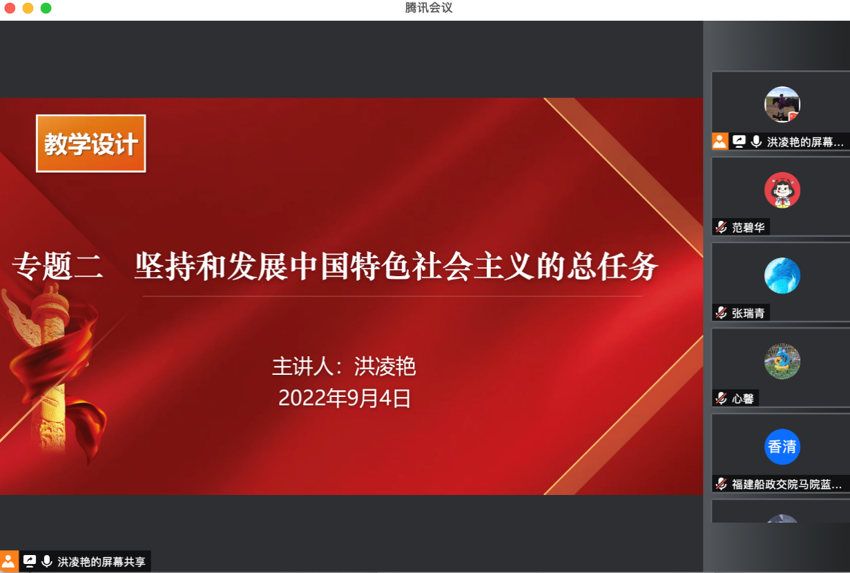 2022年9月4日,馬克思主義學院“習近平新時代中國特色社會主義思想概論”教研室全體專兼職教師在騰訊會議開展了“優(yōu)·美”教學工作坊教研活動。本次教研的內(nèi)容是本課程的“專題二 堅持和發(fā)展中國特色社會主義的總?cè)蝿铡?,由洪凌艷老師擔任主備課人。