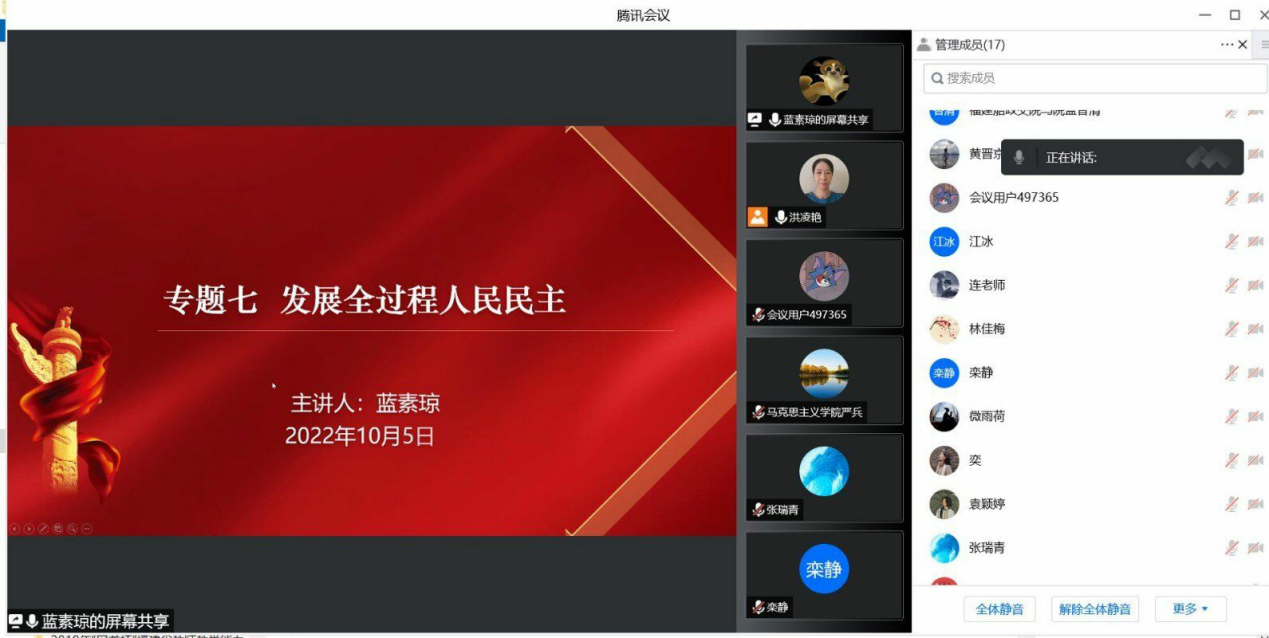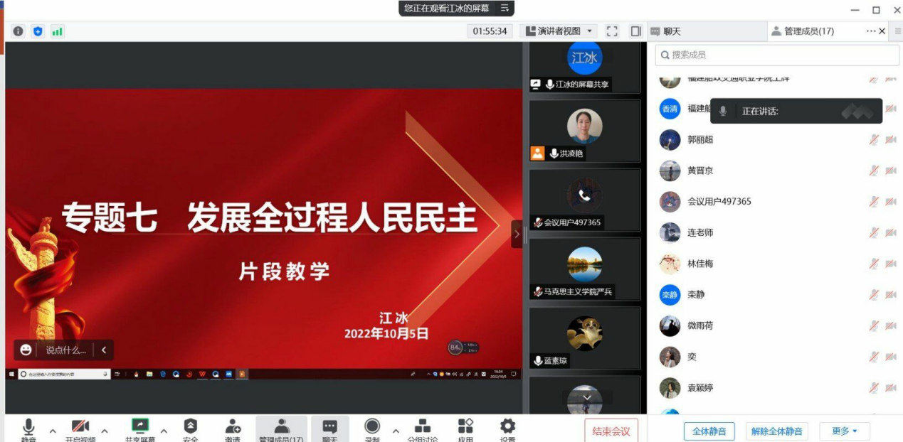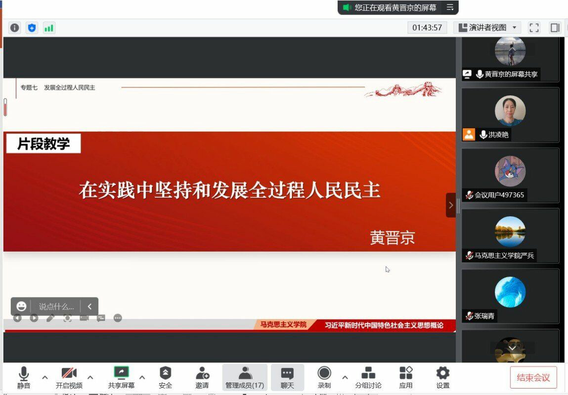 2022年10月5日馬克思主義學(xué)院習(xí)近平新時(shí)代中國(guó)特色社會(huì)主義思想概論教研室舉行了本學(xué)期第七次集體備課會(huì),由于疫情影響,本次備課會(huì)在線上進(jìn)行。由教研室主任洪凌艷老師主持,藍(lán)素瓊老師就第七專題“全過(guò)程人民民主”進(jìn)行主講,江冰老師和黃晉京老師進(jìn)行片段教學(xué)展示,全體專兼職任課教師參加了會(huì)議。會(huì)議分為兩個(gè)階段。