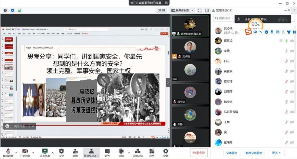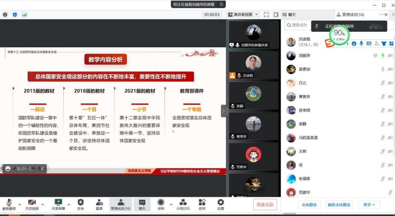 2022年11月20日,馬克思主義學(xué)院習(xí)近平新時(shí)代中國(guó)特色社會(huì)主義思想概論教研室在線上開展了第13次“優(yōu)·美”工作坊教研活動(dòng)。本次教研活動(dòng)的主題是“全面貫徹落實(shí)總體國(guó)家安全觀”,由劉麗萍老師負(fù)責(zé)主講。