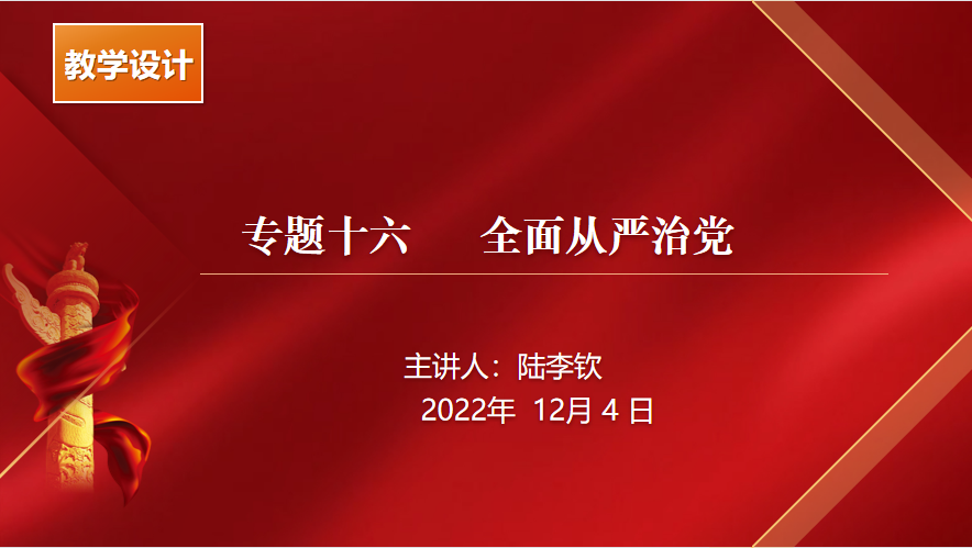 2022年12月4日,馬克思主義學(xué)院“習(xí)近平新時(shí)代中國特色社會主義思想概論”教研室全體專兼職教師在線上開展了“優(yōu)·美”教學(xué)工作坊教研活動。本次教研的內(nèi)容是本課程的“專題十六 全面從嚴(yán)治黨”,由陸李欽老師擔(dān)任主講。