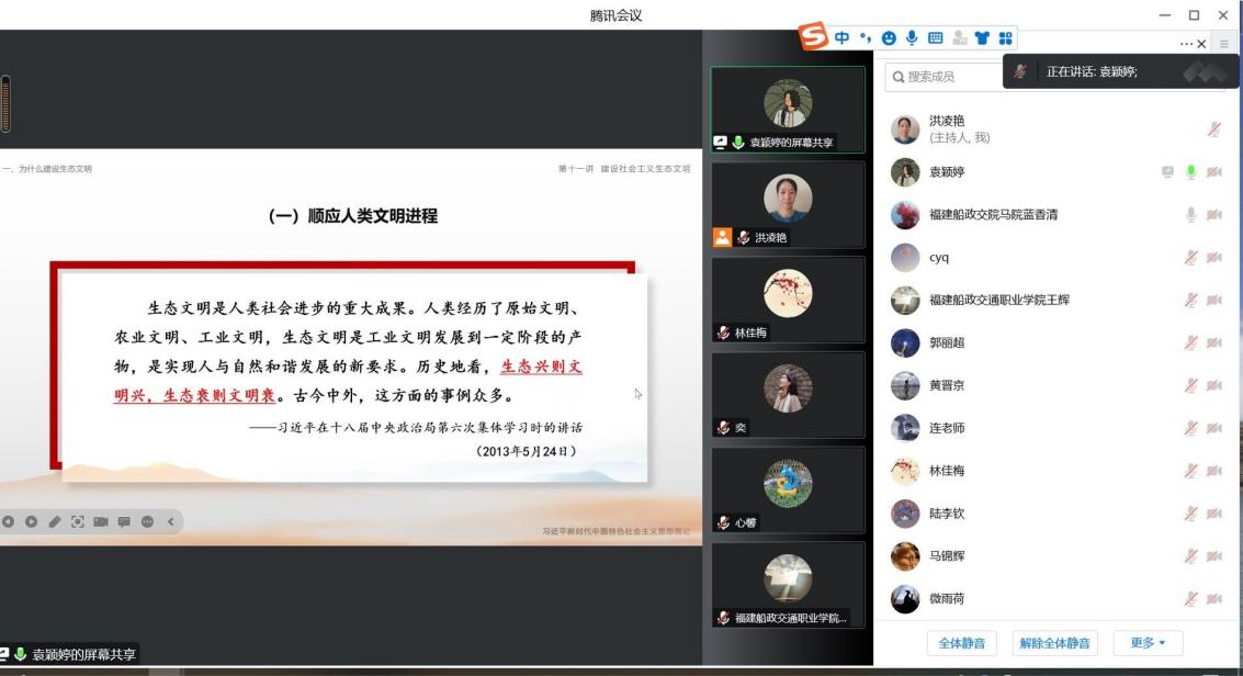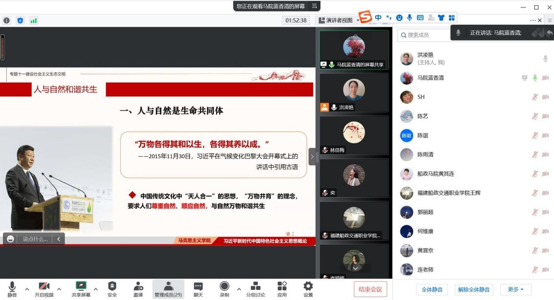 馬克思主義學(xué)院“習(xí)近平新時(shí)代中國特色社會(huì)主義思想概論”教研室全體專兼職教師于2022年10月30日在騰訊會(huì)議開展了“優(yōu)·美”教學(xué)工作坊教研活動(dòng)。本次教研的內(nèi)容是本課程的“專題十一 建設(shè)社會(huì)主義生態(tài)文明”,由王輝老師擔(dān)任主備課人。