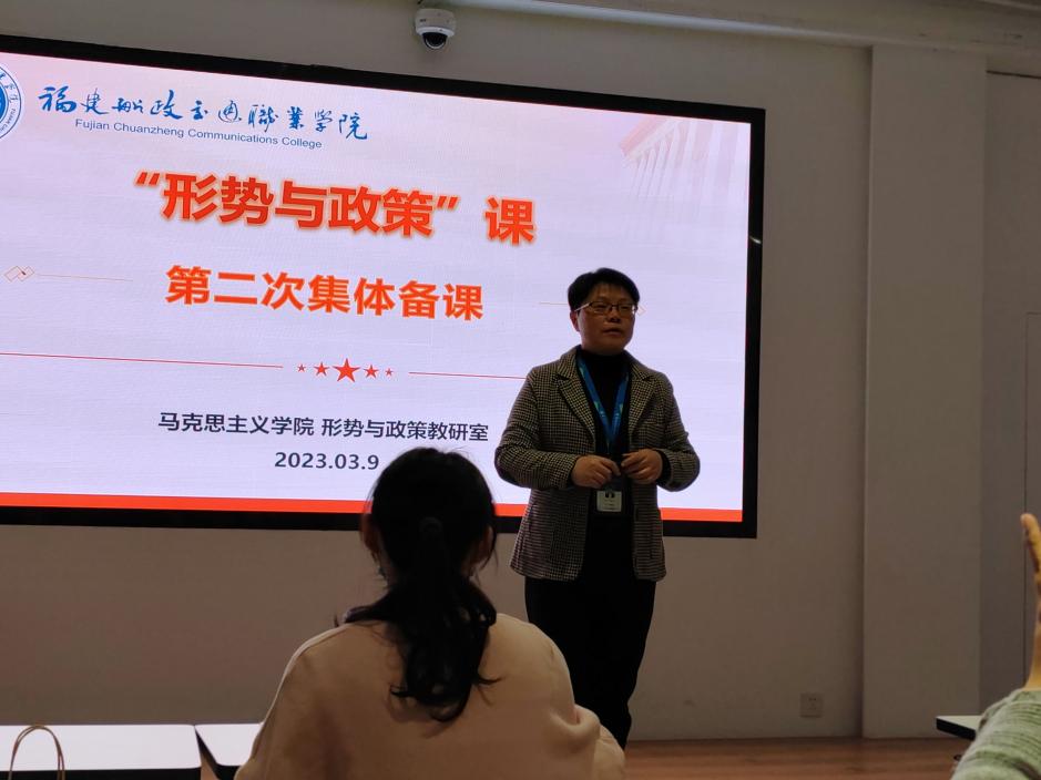 2023年3月9日,馬克思主義學(xué)院“形勢(shì)與政策”教研室在黨建館開(kāi)展了本學(xué)期“優(yōu)·美”教學(xué)工作坊第二次教研活動(dòng)。本次教研活動(dòng)圍繞“形勢(shì)與政策”課專題二“走好中國(guó)式現(xiàn)代化之路”展開(kāi),由嚴(yán)兵老師主講,石莎和梁晶老師進(jìn)行無(wú)生片段教學(xué),全體任課教師參加了教研活動(dòng)。