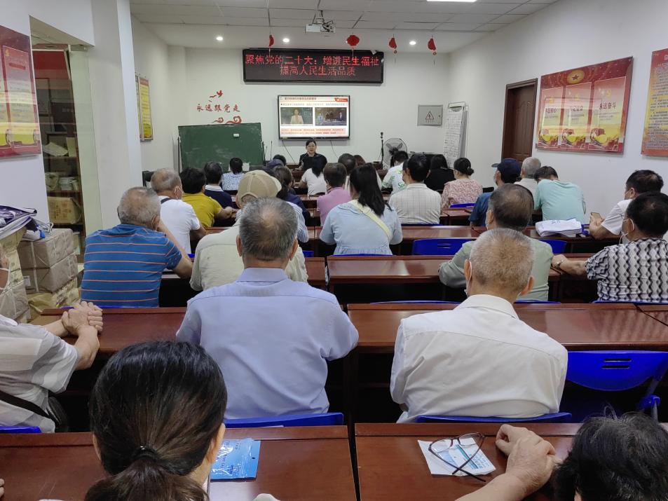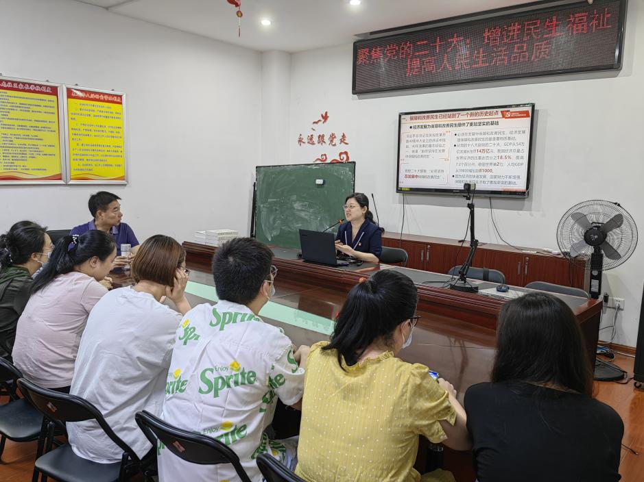 為深入開展學(xué)習(xí)貫徹習(xí)近平新時代中國特色社會主義思想主題教育,推動黨的二十大精神入腦入心、走深走實,讓廣大黨員群眾全面、準(zhǔn)確、及時地學(xué)習(xí)掌握黨的二十大精神,2023年6月16日,馬克思主義學(xué)院宣講團(tuán)成員黃晉京老師應(yīng)金山街道鑫龍社區(qū)邀請,為該社區(qū)工作人員及退休黨員講授了題為“聚焦黨的二十大:增進(jìn)民生福祉 提高人民生活品質(zhì)”黨的二十大精神專題黨課。