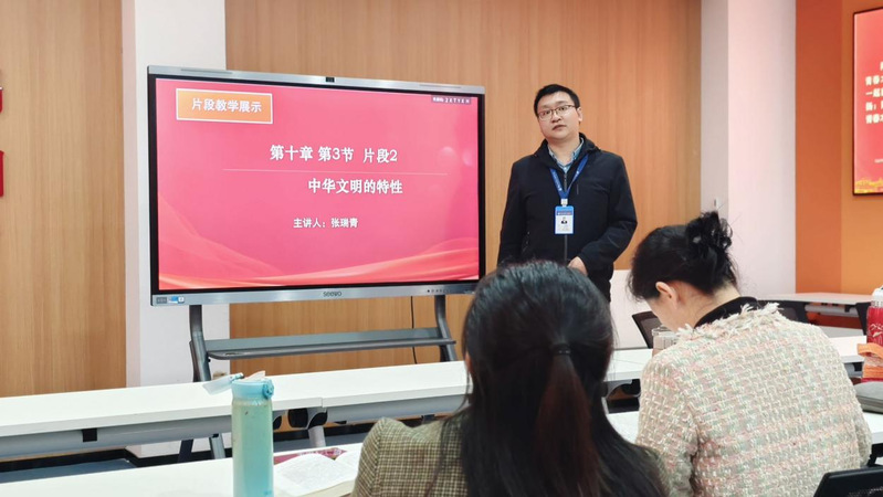 張玉祥和張瑞青兩位老師分別就《繁榮發(fā)展社會主義文化事業(yè)和文化產(chǎn)業(yè)》與《中華文明五大特性》兩個教學(xué)內(nèi)容展開片段教學(xué)展示。他們采用生動的案例,講授內(nèi)容條理清晰,綜合運用多種教學(xué)方法,既體現(xiàn)了思政課教學(xué)的學(xué)理性,也突顯了高職思政課教學(xué)的生動性,取得了良好的示范效果。