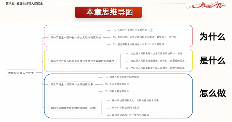 范碧華老師首先強(qiáng)調(diào)發(fā)展全過(guò)程人民民主是新時(shí)代我國(guó)民主政治建設(shè)的歷史性成就、標(biāo)志性成果,明確本章在教材中的地位;接著通過(guò)教學(xué)思維導(dǎo)圖,明晰第八章四節(jié)內(nèi)容間的整體邏輯關(guān)系,明確教學(xué)難重點(diǎn);在學(xué)情分析基礎(chǔ)上,對(duì)于本章的教學(xué)方法、案例選取給出教學(xué)建議。整個(gè)教學(xué)設(shè)計(jì)邏輯清晰、目標(biāo)明確,較好地提升了教師對(duì)第八章教學(xué)內(nèi)容及邏輯的認(rèn)識(shí)。