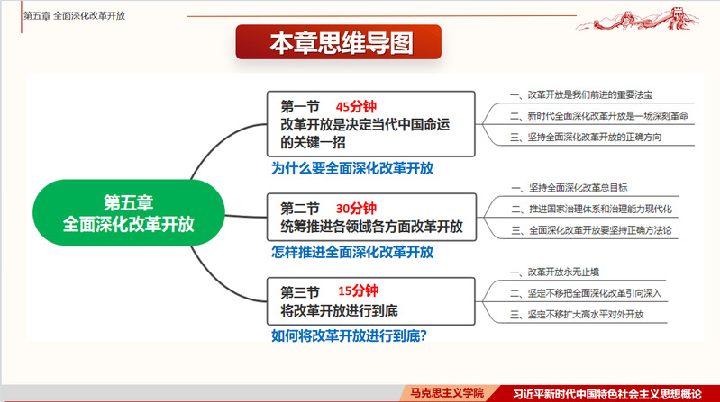 黃晉京老師主要圍繞“改革開放是決定當(dāng)代中國命運(yùn)的關(guān)鍵一招”、“統(tǒng)籌推進(jìn)各領(lǐng)域各方面改革開放”、和“將改革開放進(jìn)行到底”三個(gè)部分展開說課。尤其針對(duì)改革開放是我們前進(jìn)的重要法寶、新時(shí)代全面深化改革開放是一場(chǎng)深刻革命、堅(jiān)持全面深化改革開放的正確方向和堅(jiān)持全面深化改革總目標(biāo)等內(nèi)容進(jìn)行詳細(xì)闡釋,并結(jié)合教材和自身的教學(xué)實(shí)踐與豐富經(jīng)驗(yàn),從整體層面闡述了第五章的教學(xué)重點(diǎn)、難點(diǎn)以及對(duì)本門課程實(shí)踐教學(xué)的具體內(nèi)容及整體推進(jìn)過程提出了相關(guān)要求。