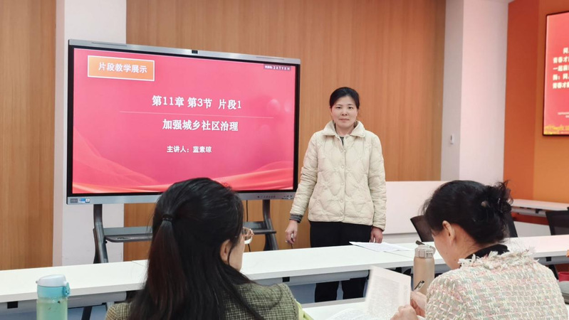 范碧華、藍(lán)素瓊兩位老師分別就《民生是人民幸福之基》與《加強(qiáng)和創(chuàng)新社會(huì)治理》兩個(gè)教學(xué)內(nèi)容展開片段教學(xué)展示。整個(gè)展示過程重點(diǎn)突出,邏輯清晰,案例、視頻使用貼切,既呈現(xiàn)了大學(xué)思政課教學(xué)的學(xué)理性,也突顯了高職思政課教學(xué)的活躍性,取得了良好的示范效果。