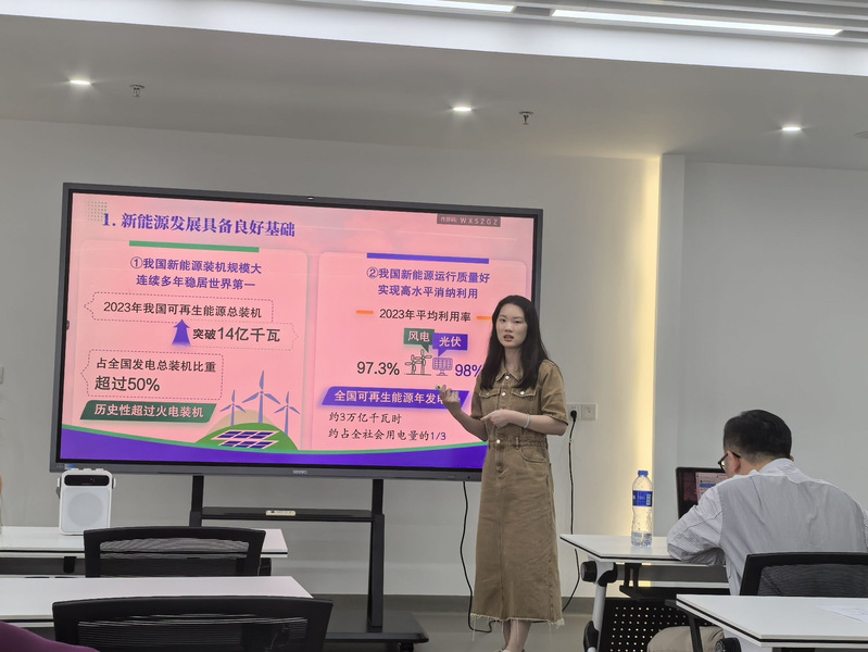 余夢莉、劉露老師兩位老師針對“新能源發(fā)展具備良好基礎(chǔ)”“正確認識新能源高質(zhì)量發(fā)展” 展開片段教學(xué)。通過設(shè)置 “發(fā)展新能源是否取代傳統(tǒng)能源” 等問題鏈,結(jié)合2024年全國節(jié)能宣傳周主題,運用案例分享與互動,讓學(xué)生明晰新能源發(fā)展路徑,強化學(xué)生對新能源高質(zhì)量發(fā)展的理解。