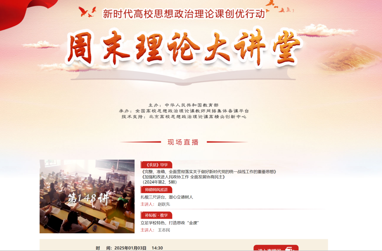 1月3日,由教育部主辦,全國高校思想政治理論課教師網(wǎng)絡(luò)集體備課平臺承辦的“周末理論大講堂”第148講開講。馬克思主義學(xué)院組織全體思政課教師觀看。