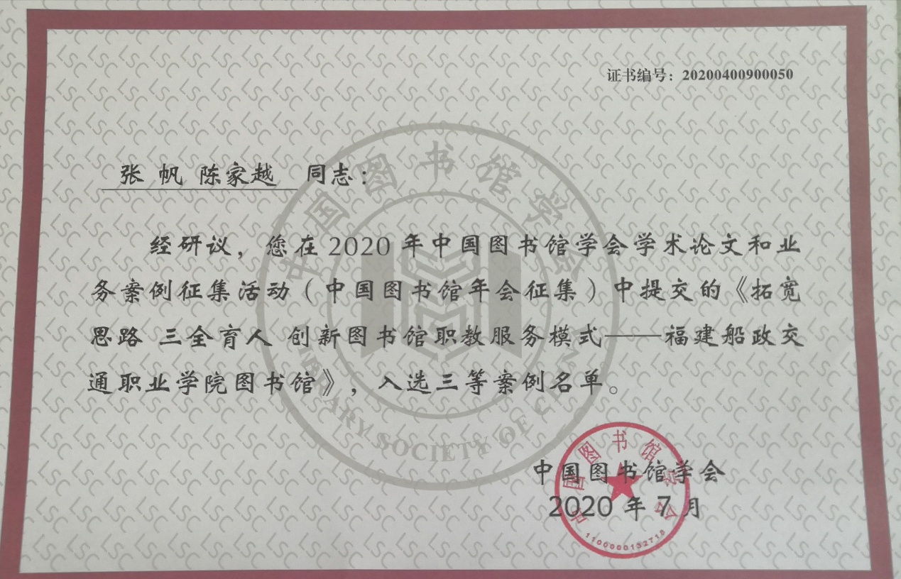 2020年,中國(guó)圖書館學(xué)會(huì)主辦了以“滋養(yǎng)民族心靈  培育文化自信”為主題的中國(guó)圖書館學(xué)會(huì)學(xué)術(shù)論文和業(yè)務(wù)案例征集活動(dòng),共設(shè)38個(gè)分主題,分為“中國(guó)圖書館年會(huì)征集”和“專題交流活動(dòng)征集”兩個(gè)大類組織實(shí)施。本次征集活動(dòng)共計(jì)征集稿件1200余篇,經(jīng)各專家組和研議會(huì)綜合評(píng)定,我館選送的業(yè)務(wù)案例《拓寬思路 三全育人創(chuàng)新圖書館職教服務(wù)模式》入選三等案例。