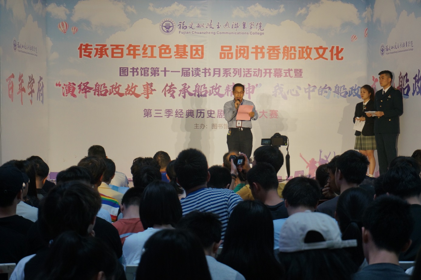 開(kāi)幕式上,張祖柱副院長(zhǎng)為此次活動(dòng)致辭,鼓勵(lì)廣大師生多讀書(shū)、讀好書(shū),充分肯定了本次活動(dòng)的重要意義,并為圖書(shū)館學(xué)生館員聯(lián)合會(huì)青年志愿者“愛(ài)心大使”頒獎(jiǎng)。同時(shí),還舉行了“我心中的船政-----第三季經(jīng)典歷史劇目展演”大賽決賽活動(dòng),通過(guò)形式多樣的藝術(shù)表現(xiàn)形式,把船政文化生動(dòng)地呈現(xiàn)給現(xiàn)場(chǎng)的評(píng)委老師以及觀眾。最終,來(lái)自安環(huán)學(xué)院的《甲午海戰(zhàn)中英勇赴海的鄧世昌》話劇作品,獲得此次比賽的一等獎(jiǎng)。