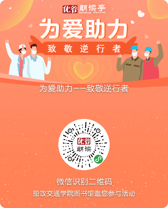 “品書(shū)香,蘊(yùn)傳承,我與船政共成長(zhǎng)”圖書(shū)館第十屆讀書(shū)月系列活動(dòng)火熱進(jìn)行中,圖書(shū)館與優(yōu)谷朗讀亭聯(lián)合發(fā)起 “為愛(ài)助力——致敬逆行者”行動(dòng),讓我們告白所有在這場(chǎng)"戰(zhàn)疫"中努力和奉獻(xiàn)的人們!