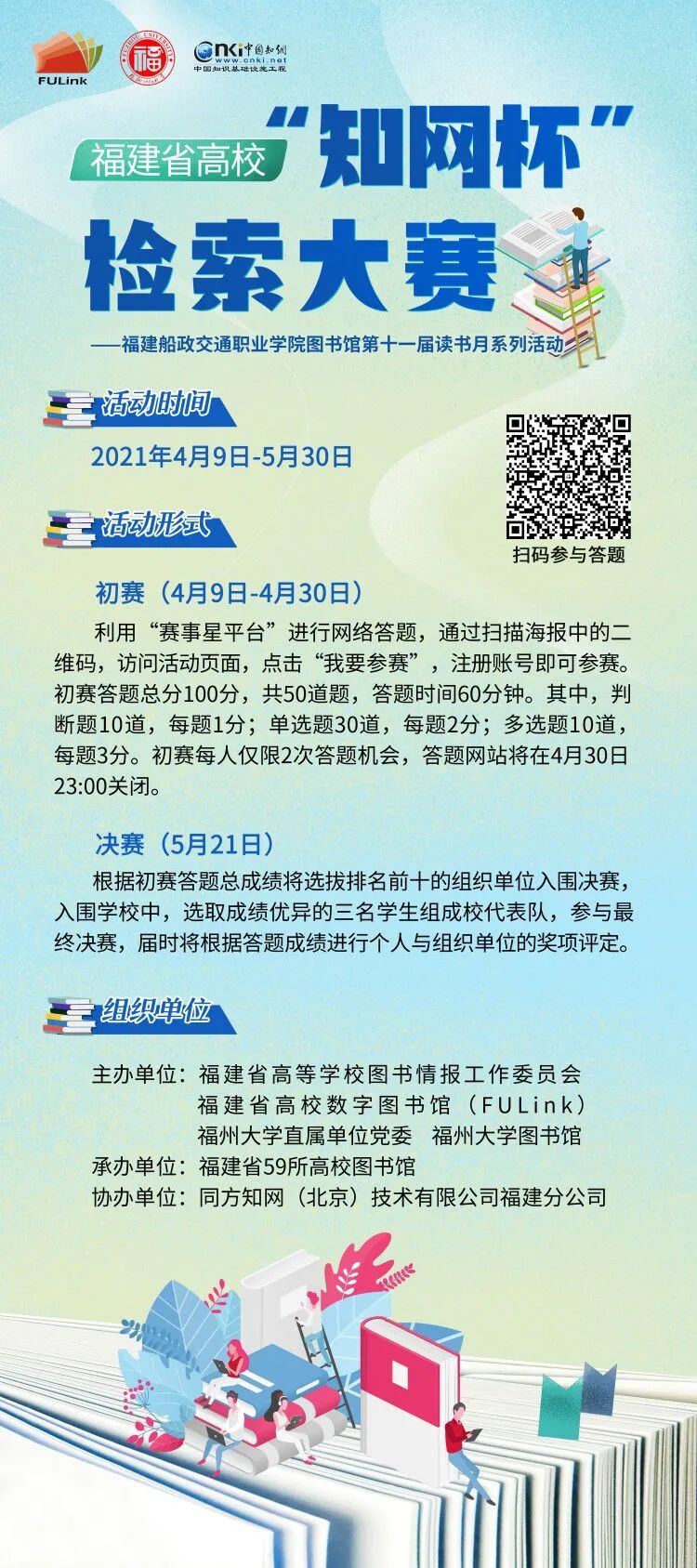 2021年是中國(guó)共產(chǎn)黨成立100周年,也是“十四五”開局之年,在第26個(gè)“世界讀書日”到來之際,福建省高等學(xué)校圖書情報(bào)工作委員會(huì)特舉辦“知網(wǎng)杯”檢索大賽,號(hào)召在校大學(xué)生學(xué)習(xí)黨史,養(yǎng)浩然正氣,努力踐行習(xí)近平總書記“修身慎行,懷德自重,敦方正直,清廉自守”的要求,希望以賽促學(xué),獻(xiàn)禮黨慶?,F(xiàn)將有關(guān)事項(xiàng)通知如下: