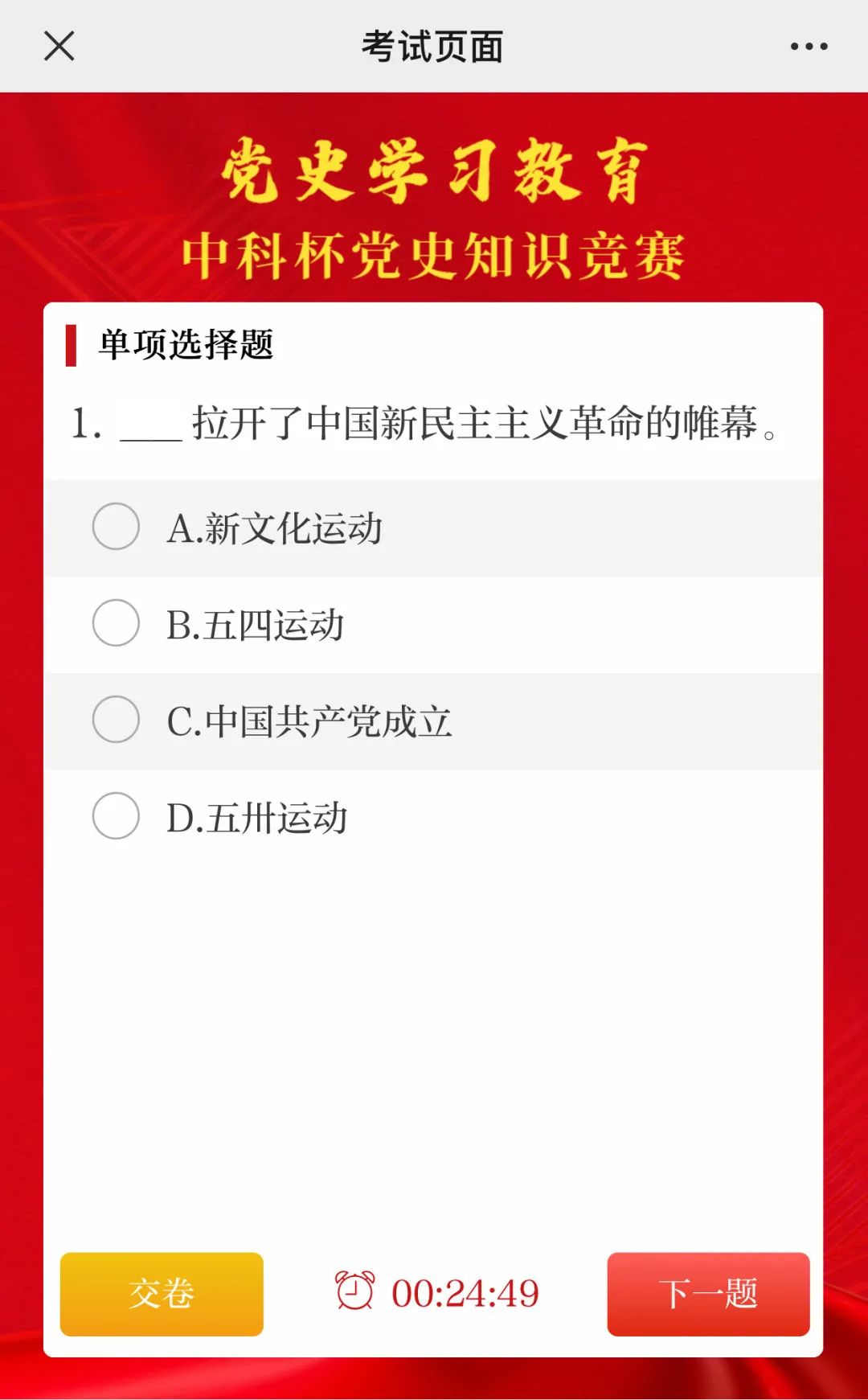4.答題時(shí)限是25分鐘,進(jìn)入答題頁(yè)面則系統(tǒng)自動(dòng)開(kāi)始倒計(jì)時(shí)。參賽者作答完畢可以隨時(shí)提前交卷;為防作弊,答題中途退出時(shí),倒計(jì)時(shí)將繼續(xù)計(jì)時(shí);25分鐘倒計(jì)時(shí)結(jié)束后,系統(tǒng)將自動(dòng)交卷。