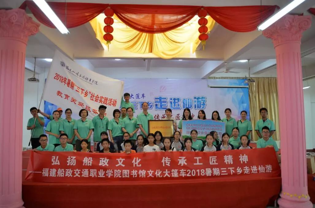 2018年我館依托圖書館“文化大篷車”項(xiàng)目,組成教育關(guān)愛服務(wù)團(tuán)“三下鄉(xiāng)”服務(wù)隊(duì),開展“弘揚(yáng)船政文化,傳承工匠精神”----圖書館文化大篷車2018暑期三下鄉(xiāng)走進(jìn)仙游活動(dòng)中開展豐富多彩的活動(dòng),取得喜人的成績,獲得了共青團(tuán)福建省委授予的福建省大中專學(xué)生暑期“三下鄉(xiāng)”社會(huì)實(shí)踐活動(dòng)“先進(jìn)集體”的榮譽(yù)稱號(hào).
