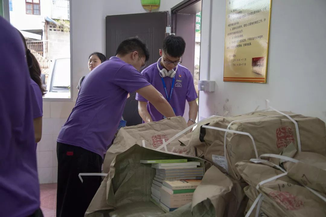 實(shí)踐團(tuán)隊(duì)成員為愛(ài)心農(nóng)家書(shū)屋搬運(yùn)整理書(shū)籍