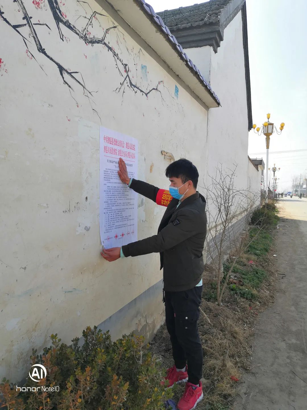 圖為許耀在張貼防疫宣傳單