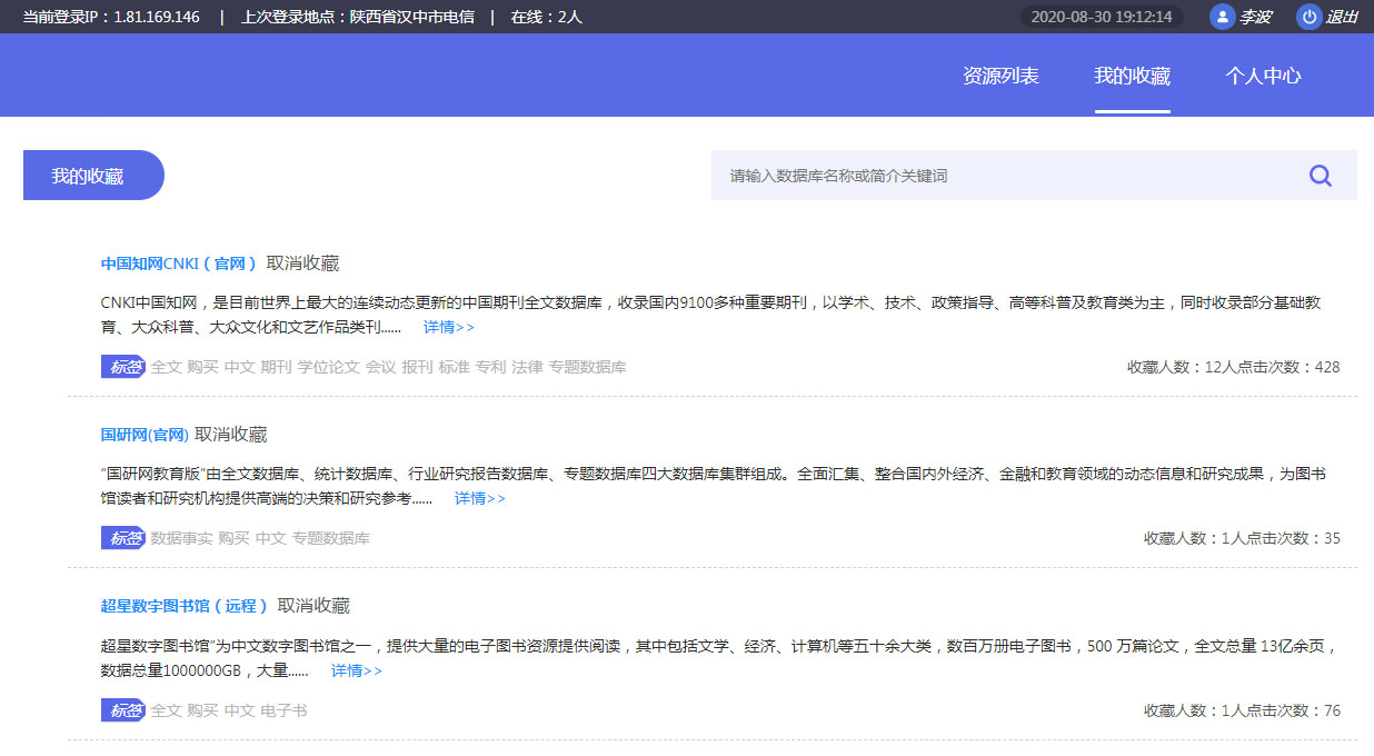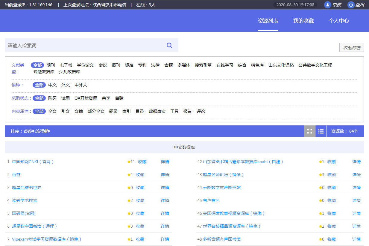 在登陸后的電子資源界面里我們能夠看到圖書館已對(duì)我們開(kāi)放的電子資源,在點(diǎn)擊相應(yīng)的電子資源名稱后便能夠?yàn)g覽其中的內(nèi)容了、經(jīng)常使用的可以收藏起來(lái),方便下次使用。