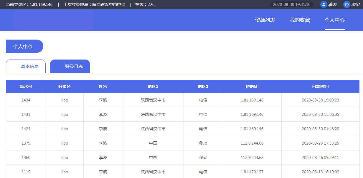 登錄日志中展示了當(dāng)前用戶的歷史登錄信息,包含登錄地點(diǎn)、登錄IP等信息,方便了解自己的賬號(hào)安全情況。