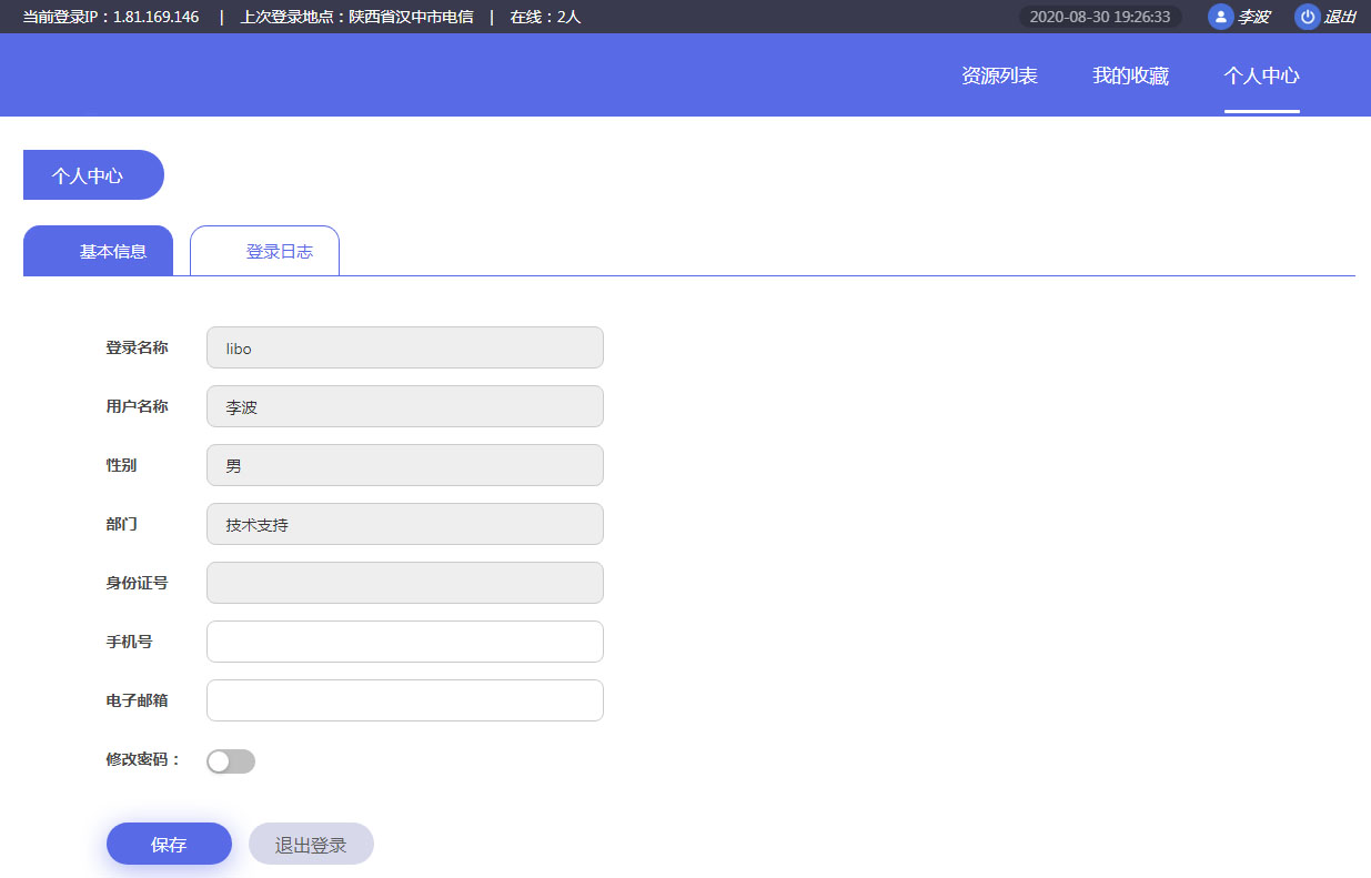 基本信息頁(yè)面可以維護(hù)自己的手機(jī)號(hào)、郵箱信息,還可以進(jìn)行修改自己的登錄密碼。