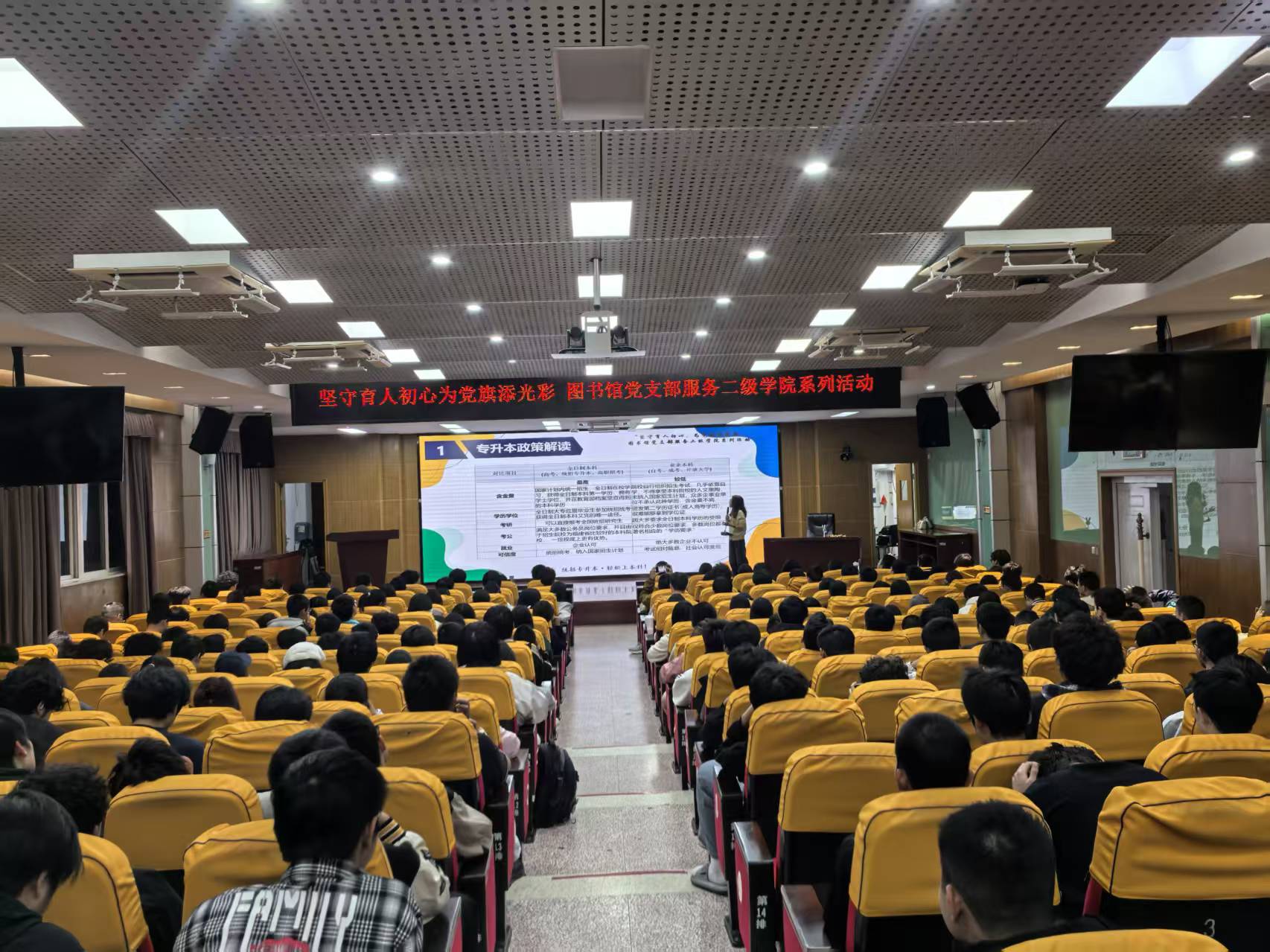 為幫助2025級(jí)新生精準(zhǔn)把握專升本政策導(dǎo)向,科學(xué)規(guī)劃學(xué)業(yè)生涯,2025年11月19日晚7時(shí)在福道園行政樓6樓學(xué)術(shù)廳,圖書館黨支部開展服務(wù)二級(jí)學(xué)院系列活動(dòng)——舉辦“專升本學(xué)習(xí)規(guī)劃”專題講座。邀請(qǐng)專升本政策規(guī)劃師曾巧霞老師為同學(xué)們作專升本政策解讀與報(bào)考指導(dǎo),2025級(jí)近300名同學(xué)聆聽了講座。