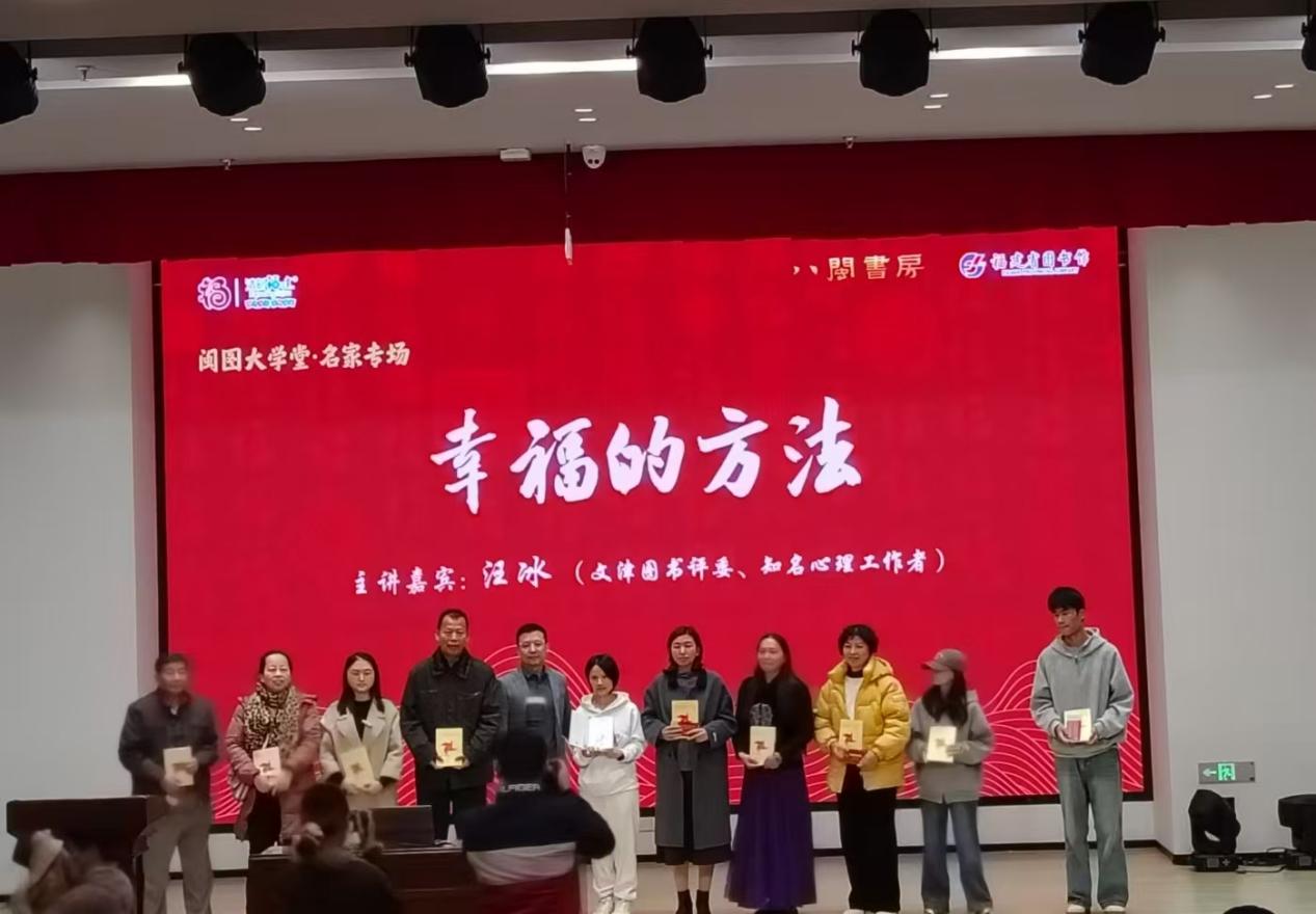 活動現(xiàn)場志愿者擔任會場引導員,保障講座秩序井然,并聆聽了閩圖大學堂·名家舉辦的《幸福的方法》講座。講座中,專家從積極心理學視角出發(fā),生動闡述幸福的內(nèi)涵與實踐途徑?;迎h(huán)節(jié)氣氛熱烈。大家紛紛表示,這場講座不僅啟發(fā)了他們對個人幸福的思考,更讓他們深刻體會到,在奉獻社會、服務他人的實踐中,自身所獲得的成長與滿足感,正是幸福的重要源泉。