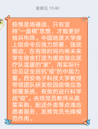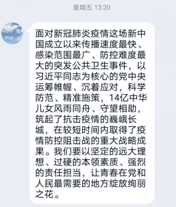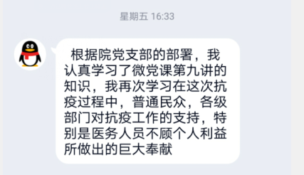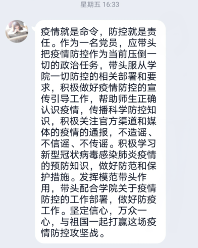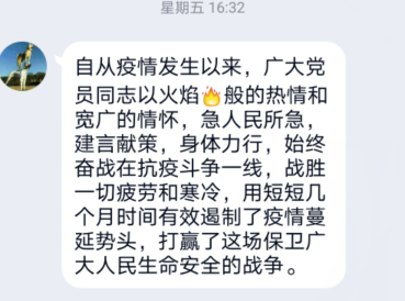 通過(guò)觀看微黨課,大家表示,在當(dāng)前常態(tài)化疫情防控下,學(xué)院廣大師生黨員要始終繃緊弦、守好責(zé)、勇?lián)?dāng),讓黨旗始終飄揚(yáng)在疫情防控和立德樹人事業(yè)發(fā)展全過(guò)程。黨員同志們也更加感受到在這場(chǎng)沒(méi)有硝煙的戰(zhàn)役中,黨中央運(yùn)籌帷幄、沉著應(yīng)對(duì),高校黨員沖鋒在第一線、戰(zhàn)斗在最前沿,匯聚起共同抗疫的磅礴偉力,集中體現(xiàn)了中國(guó)力量、中國(guó)精神、中國(guó)效率。