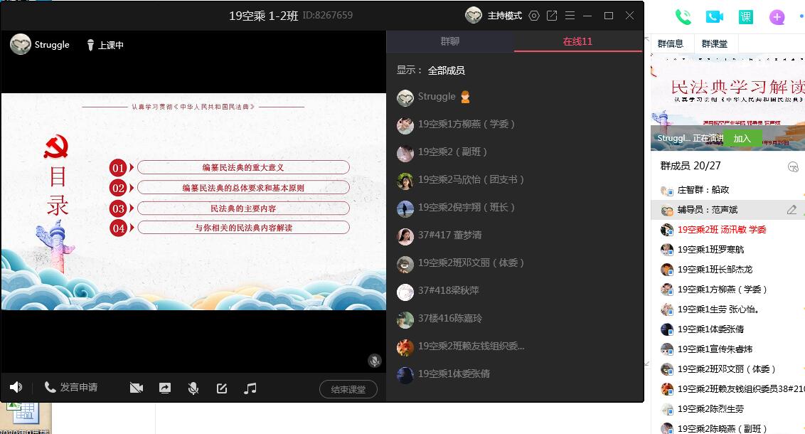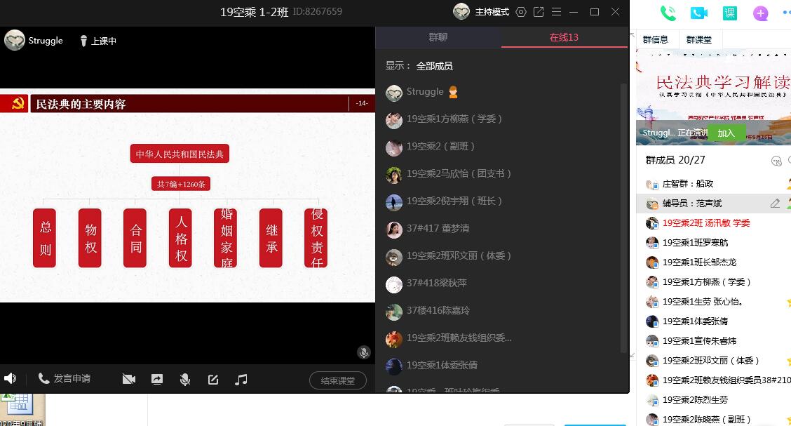 為認(rèn)真貫徹實施和普及宣傳好民法典,學(xué)習(xí)《中華人民共和國民法典》,提升廣大學(xué)生的法律素養(yǎng),強(qiáng)化法治信仰。通用航空產(chǎn)業(yè)學(xué)院輔導(dǎo)員范聲斌、莊智群老師,于9月15-16日組織我院學(xué)生通過“線上+線下”,召開《中華人民共和國民法典》專題學(xué)習(xí)會。