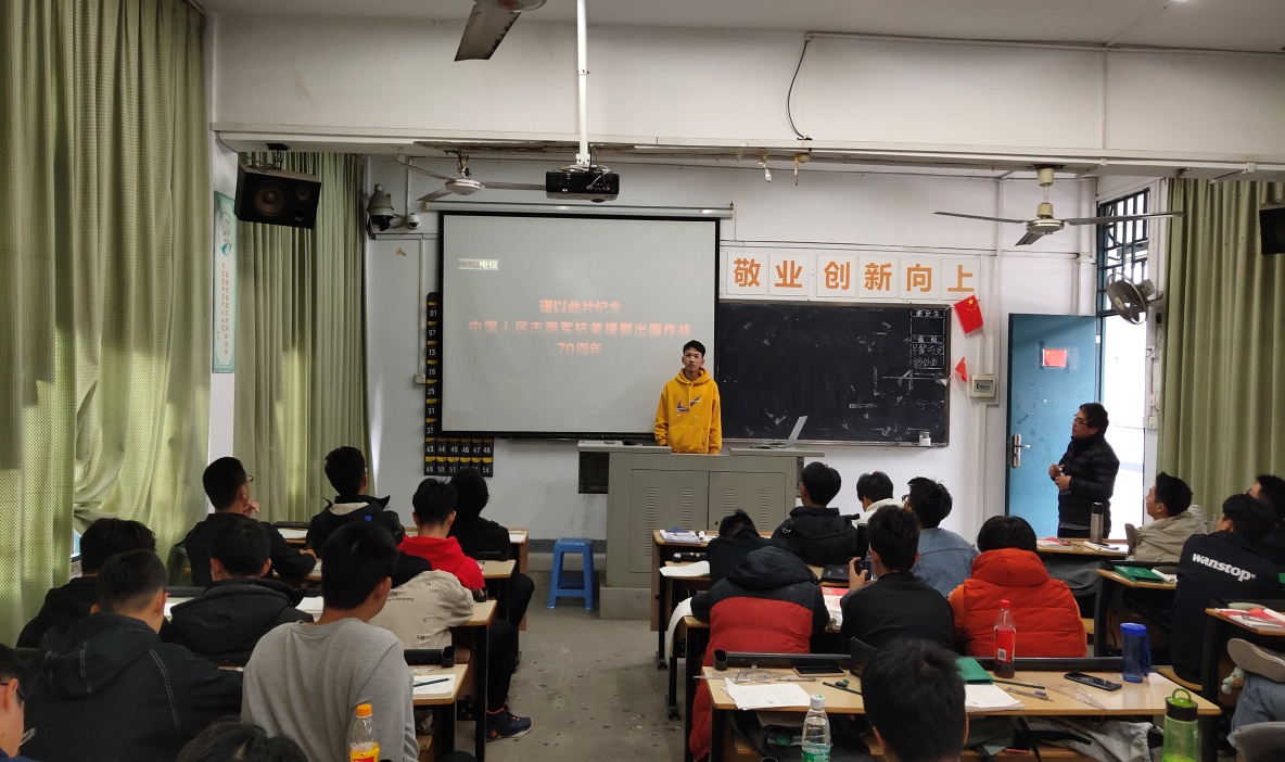 為深入貫徹落實(shí)習(xí)近平總書記在紀(jì)念中國(guó)人民志愿軍抗美援朝出國(guó)作戰(zhàn)70周年大會(huì)上的重要講話精神,深入開展“四史”學(xué)習(xí)教育,大力弘揚(yáng)偉大的抗美援朝精神,加強(qiáng)新時(shí)代愛國(guó)主義教育,教育引導(dǎo)廣大學(xué)生厚植愛國(guó)主義情懷。12月5日,輔導(dǎo)員范聲斌于8號(hào)樓階梯教室,召開主題班會(huì)介紹革命傳統(tǒng)、講述英雄事跡、分享個(gè)人對(duì)于觀看《為了和平》感受,要求學(xué)生要銘記抗美援朝戰(zhàn)爭(zhēng)的艱辛歷程和偉大勝利,緬懷先烈的英勇事跡,更要學(xué)習(xí)前輩的崇高精神,珍惜當(dāng)下的和平生活,牢記使命和責(zé)任,與學(xué)生共情、共鳴、共振。