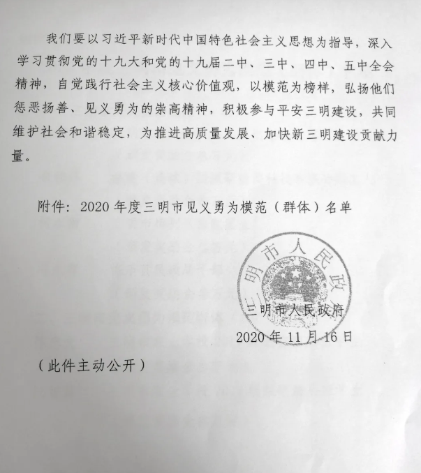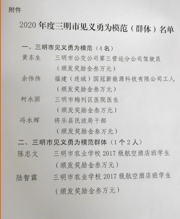 陳忠文和陸智霖勇制歹徒的英勇行為受到當(dāng)?shù)刭潛P,陳忠文和陸智霖同學(xué)被評為“2020年度三明市見義勇為模范群體”。他們受邀參加了2019-2020年度見義勇為表彰大會,《三明農(nóng)校青年之聲》對他們的事跡進行了報道。