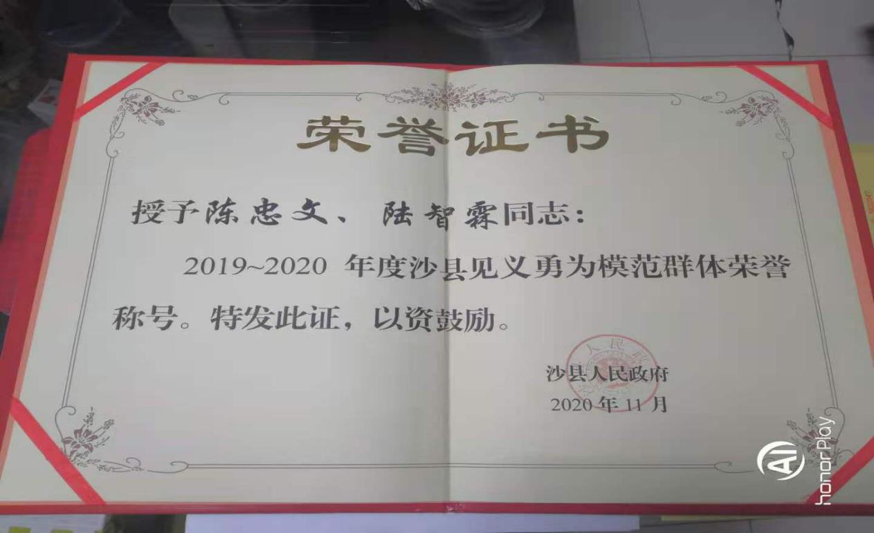 2019年10月11日,沙縣某山莊發(fā)生傷人事件,陳忠文和陸智霖不顧個人安危,全力搜尋并阻止企圖逃跑的歹徒,陳忠文腹部被打傷,陸智霖手臂被劃破,用盡力氣共制歹徒,直至警車到達現(xiàn)場。危急關(guān)頭,他們挺身而出,面對窮兇極惡的歹徒,他們不懼危險,用沉著冷靜和堅毅勇敢詮釋了什么是英勇無畏,他們用實際行動保護了人民群眾的安全,弘揚社會正能量。