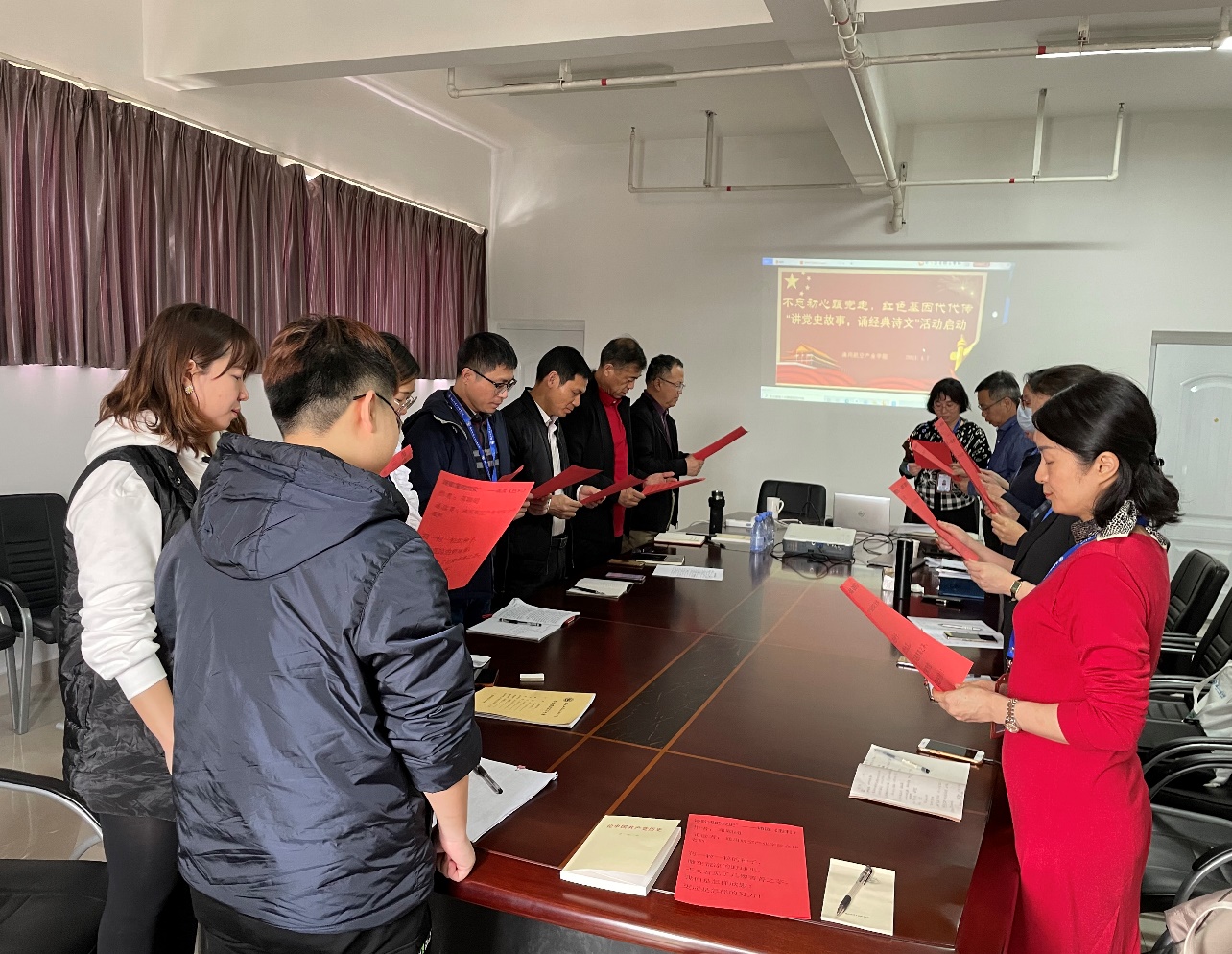 將一粒一粒的種子,撒在荒涼的野地里,不久看見了幾櫻菁菁之茅。我們是怎樣欣慰!更應(yīng)是怎樣的努力!”通用航空產(chǎn)業(yè)學(xué)院老師們深情朗誦鄧穎超先生寫的《勝利》》詩文。用黨史的聲音滌蕩心靈,參加支部主題黨日的黨員干部們莊嚴(yán)肅立,沉浸在詩文的情景,深受感染,心情振奮,在朗朗誦讀聲中,發(fā)自肺腑地感受著人“為人民謀幸福,為中華民族謀復(fù)興”的初心和使命。
