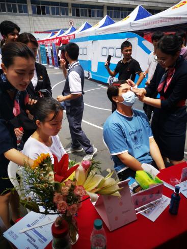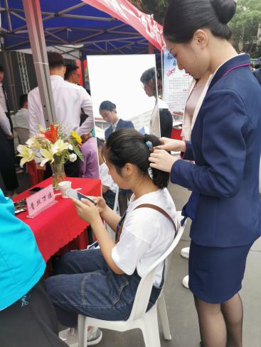 在現(xiàn)場,空乘專業(yè)的師生們搭建了化妝工位、發(fā)型塑造工位、絲巾工位、領(lǐng)帶工位,通過絲絲入扣教現(xiàn)場的來賓絲帶的配搭技巧,紳士酒窩來教授如何正確的進行系領(lǐng)帶,青絲萬縷幫來賓們盤發(fā),告訴來賓如何更好的打理自己的發(fā)型,展示自己,濃妝淡抹是當天最受歡迎的展臺,絡(luò)繹不絕的來賓到這里學習在職場在生活中,如何得體的化妝,展示更好的自己。