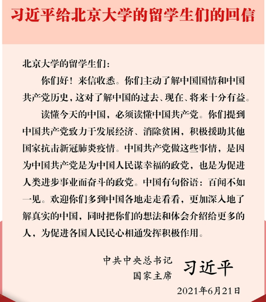 6月21日,中共中央總書記、國家主席習近平給北京大學的留學生們回信,鼓勵他們更加深入地了解真實的中國,把想法和體會介紹給更多的人,為促進各國人民民心相通發(fā)揮積極作用。
