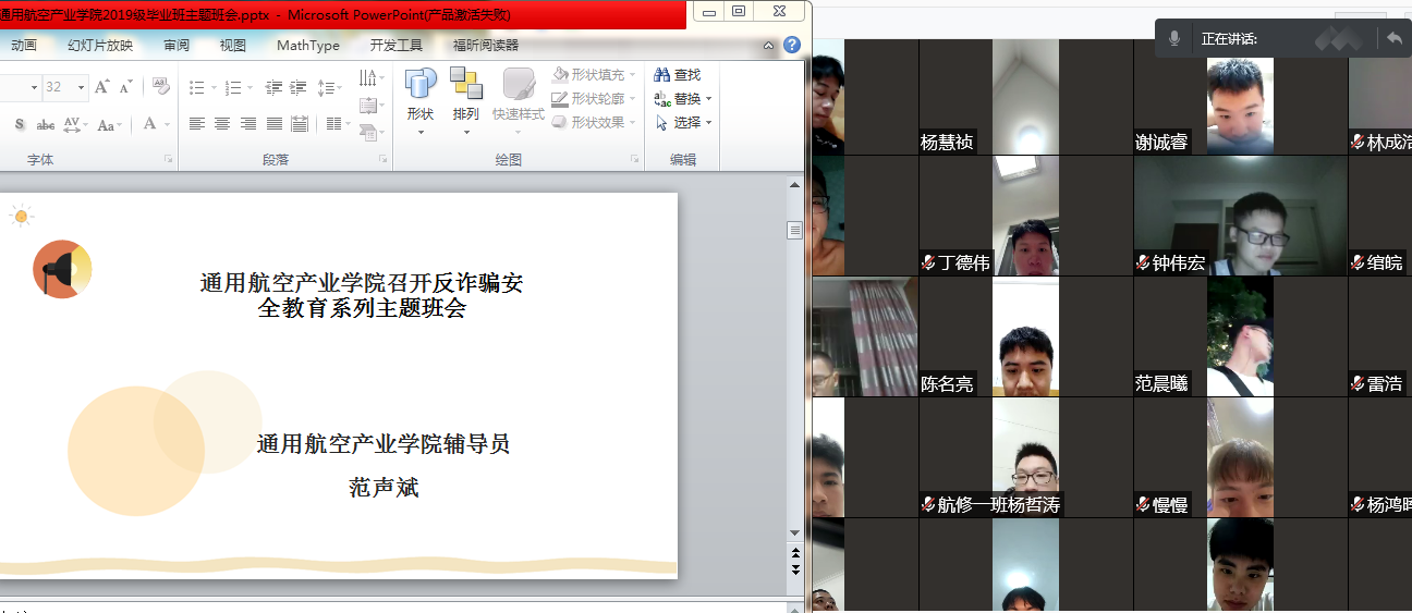 隨著社會(huì)的發(fā)展,信息技術(shù)的進(jìn)步,各種詐騙現(xiàn)象也成為社會(huì)日益突出的問題,為了讓同學(xué)們發(fā)現(xiàn)問題并及時(shí)解決,提高校園防范詐騙意識(shí),降低校園詐騙的風(fēng)險(xiǎn),增強(qiáng)學(xué)生自我保護(hù)意識(shí)和避險(xiǎn)能力,保障學(xué)生安全。通用航空產(chǎn)業(yè)學(xué)院通過線上+線下召開防詐騙安全教育暨開學(xué)第一課主題班會(huì),主題班會(huì)由輔導(dǎo)員范聲斌老師、輔導(dǎo)員陸李欽及各班主任主持。